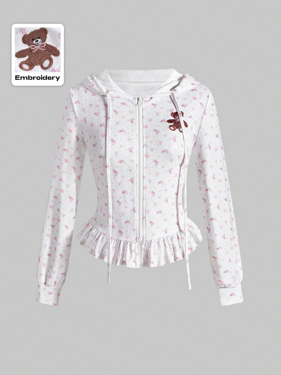 Kawaii Vintage Rüschen Mesh Patchwork Kapuzen-Reißverschluss-Sweatshirt mit Blumen-Bär-Stickerei für Frauen