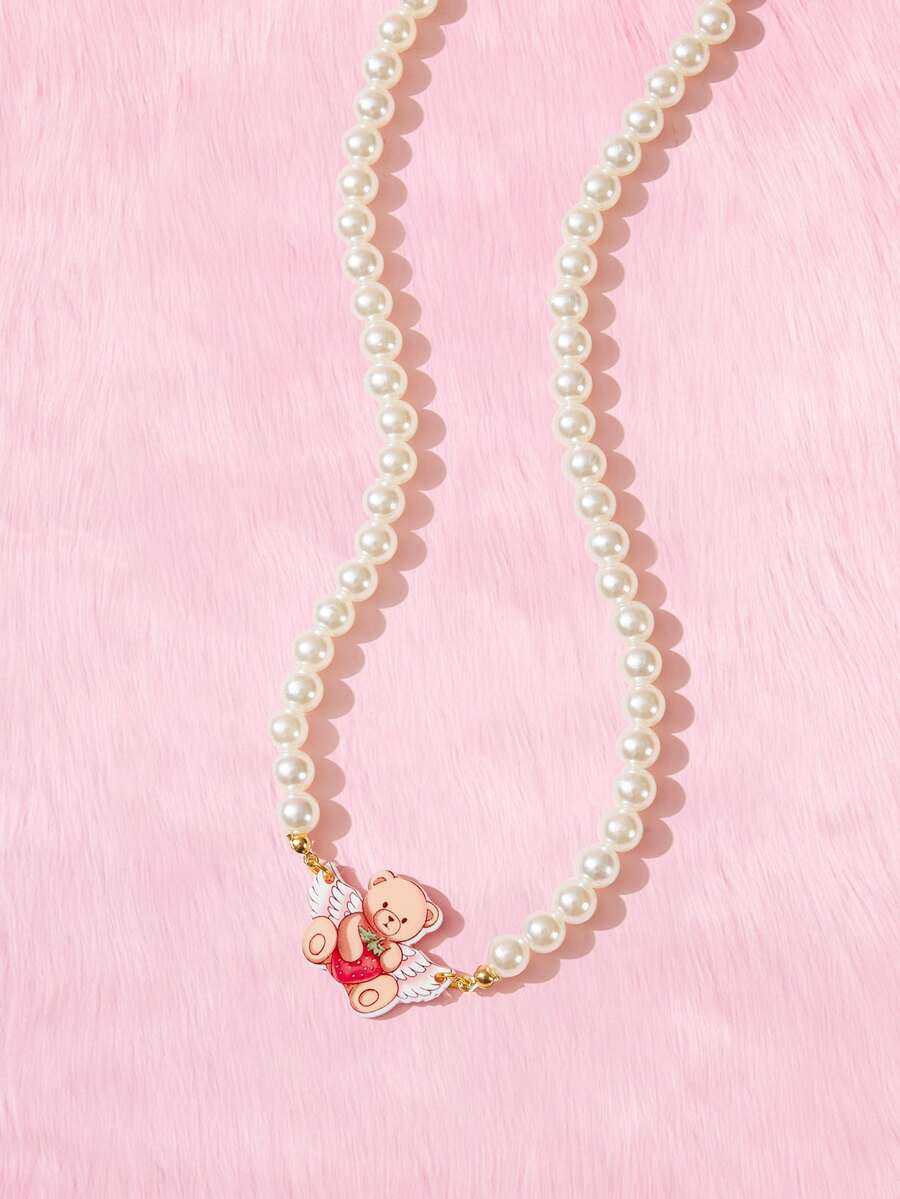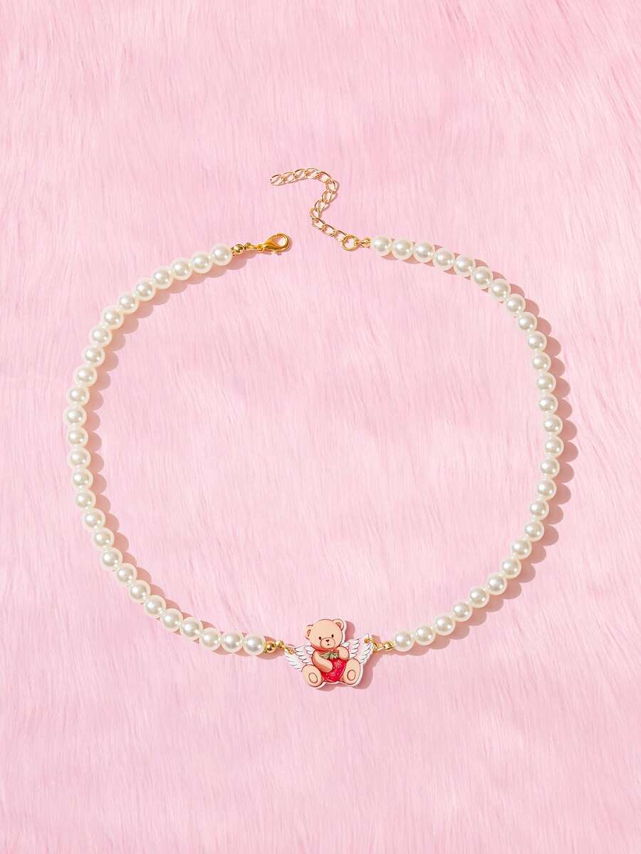 Kawaii Halskette mit Flügel Dekor, Cartoon Bären Anhänger, Kunstperle