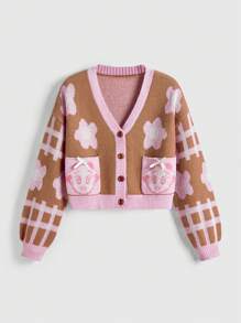 Kawaii Damen lässige Strickjacke mit Blumen- und Tiermuster, Herbst/Winter