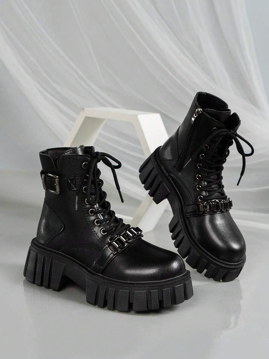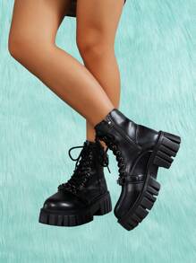 Kawaii Damen Kampfstiefel mit Schnürung vorne und seitlichem Reißverschluss, coole Outdoor Modestiefel