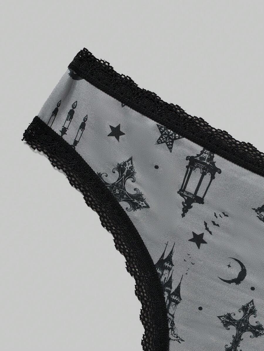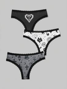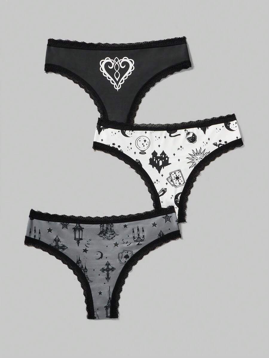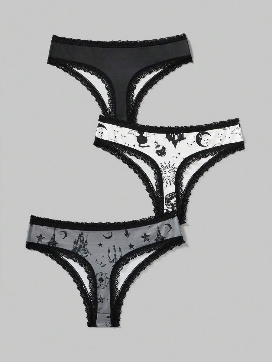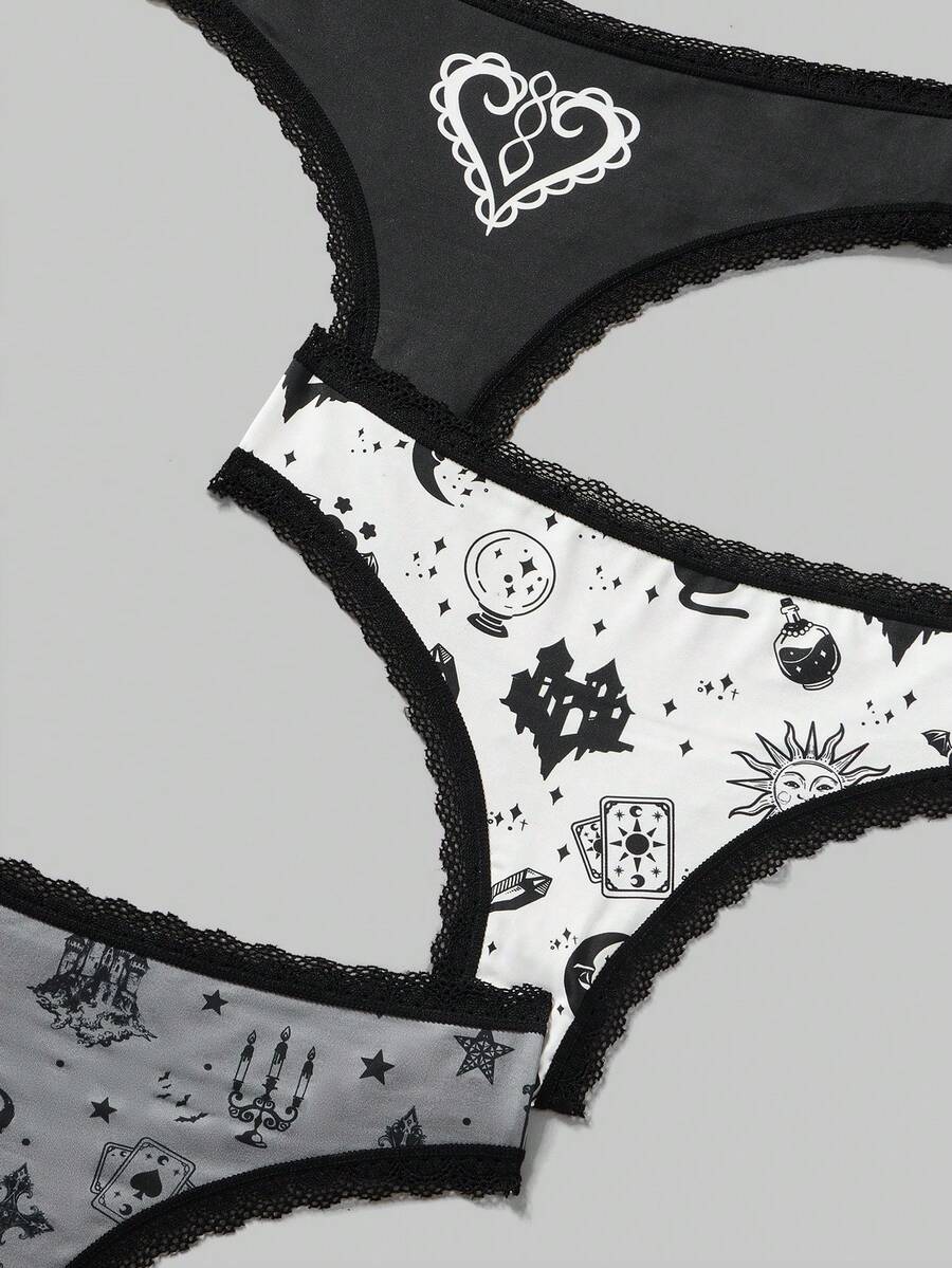 Kawaii Frauen Gothic Lolita Stil Spitze Splicing Sonne & Portrait Druckunterwäsche, 3 Stücke/paket