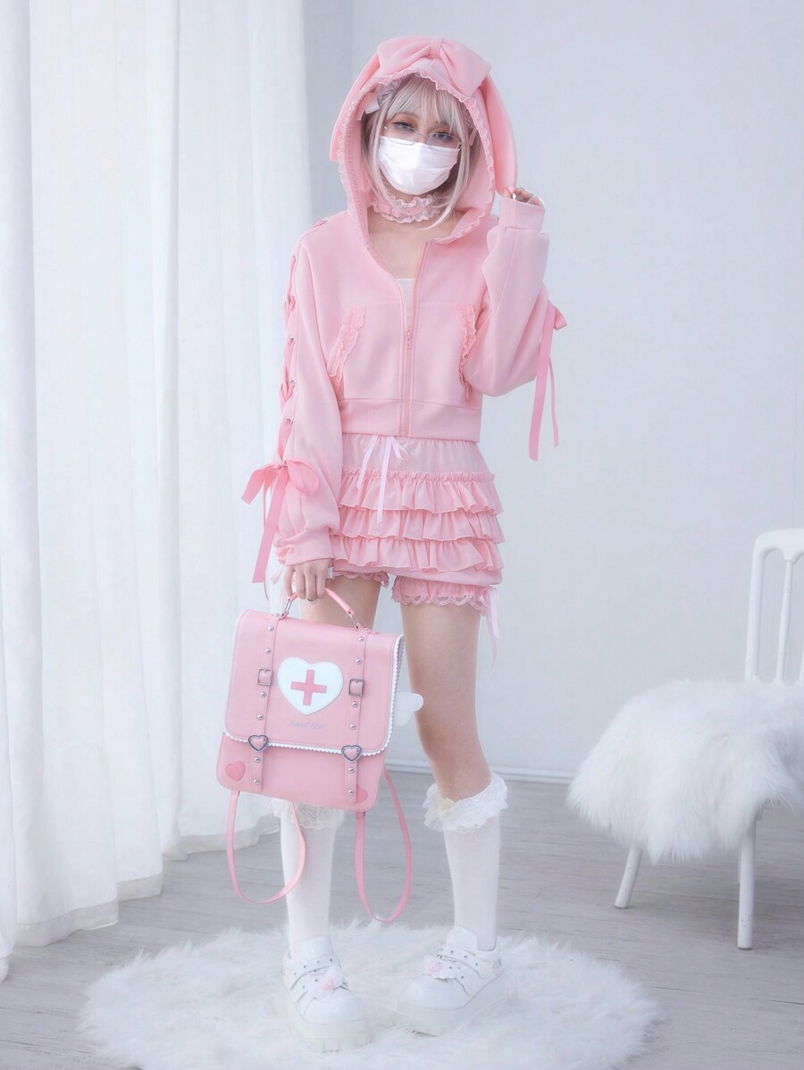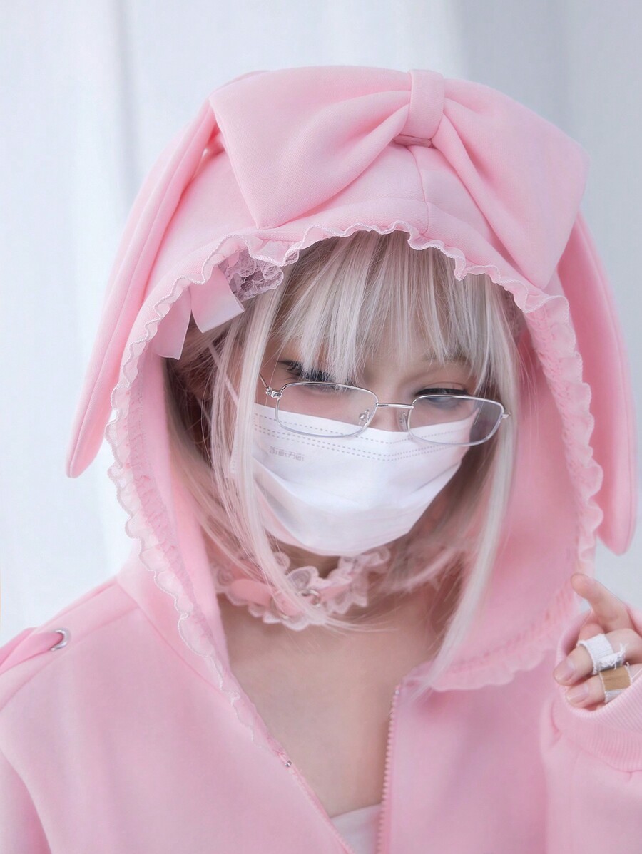 Kawaii Damen Sweatshirt mit Kapuze, Kaninchen-Ohren, Schleife und Kordelverschluss, Spitzenbesatz
