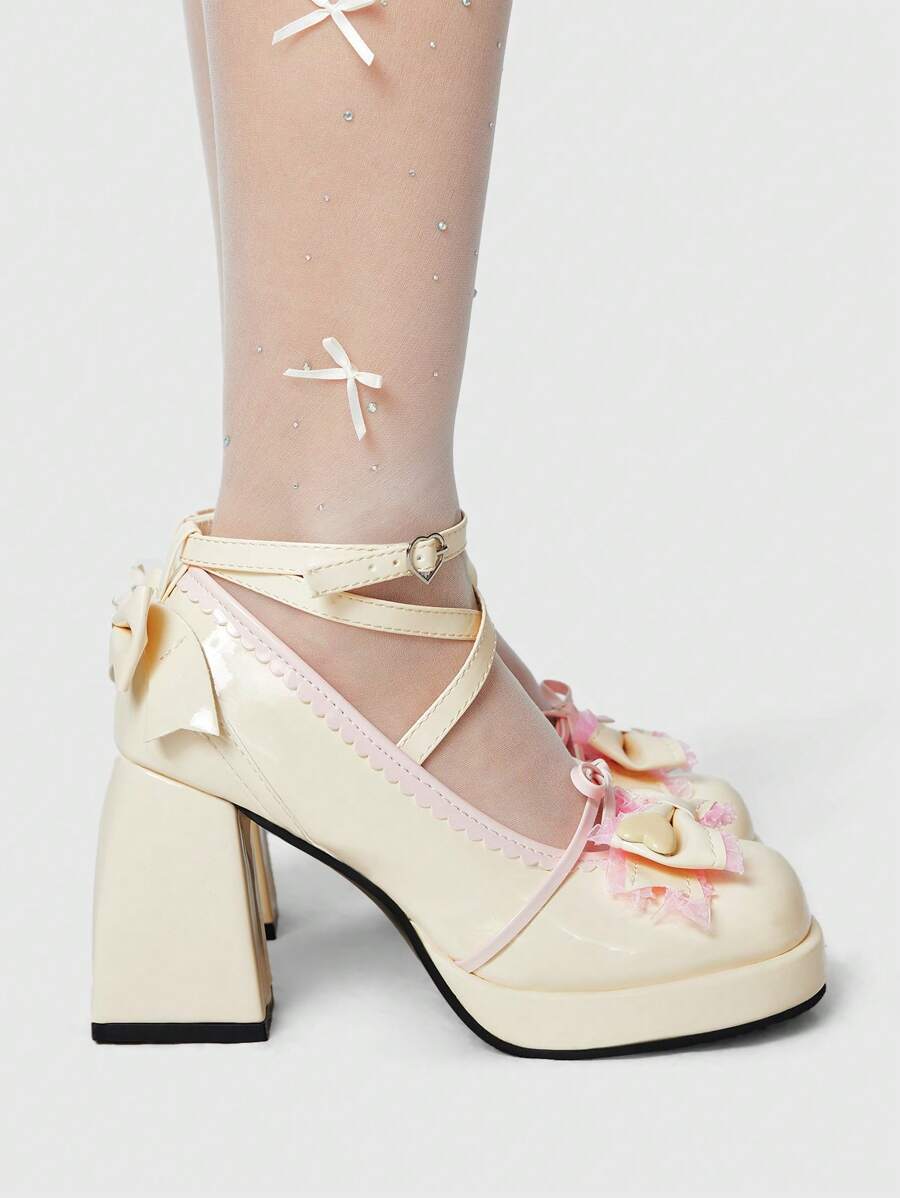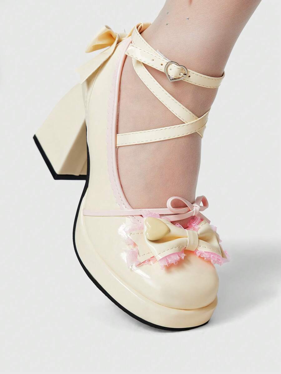 Kawaii Damen Mary Jane Stil Schuhe mit dickem Absatz und Schleifen-Verzierung, wasserdichte Plateauschuhe, runde Zehenform Mule Schuhe, gelbe Herzform Absätze für formelle Kleider am Valentinstag