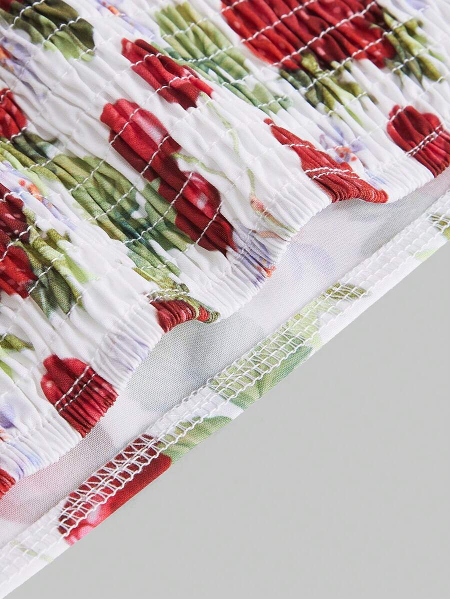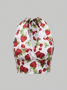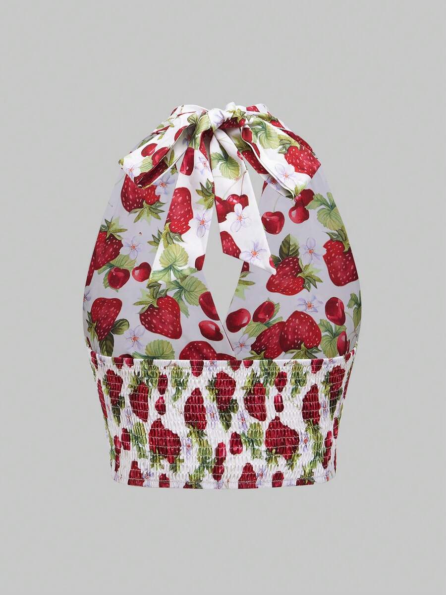 Kawaii Damen Oberteil mit Halsband und Rückenbindung, mit Erdbeermuster, Schule