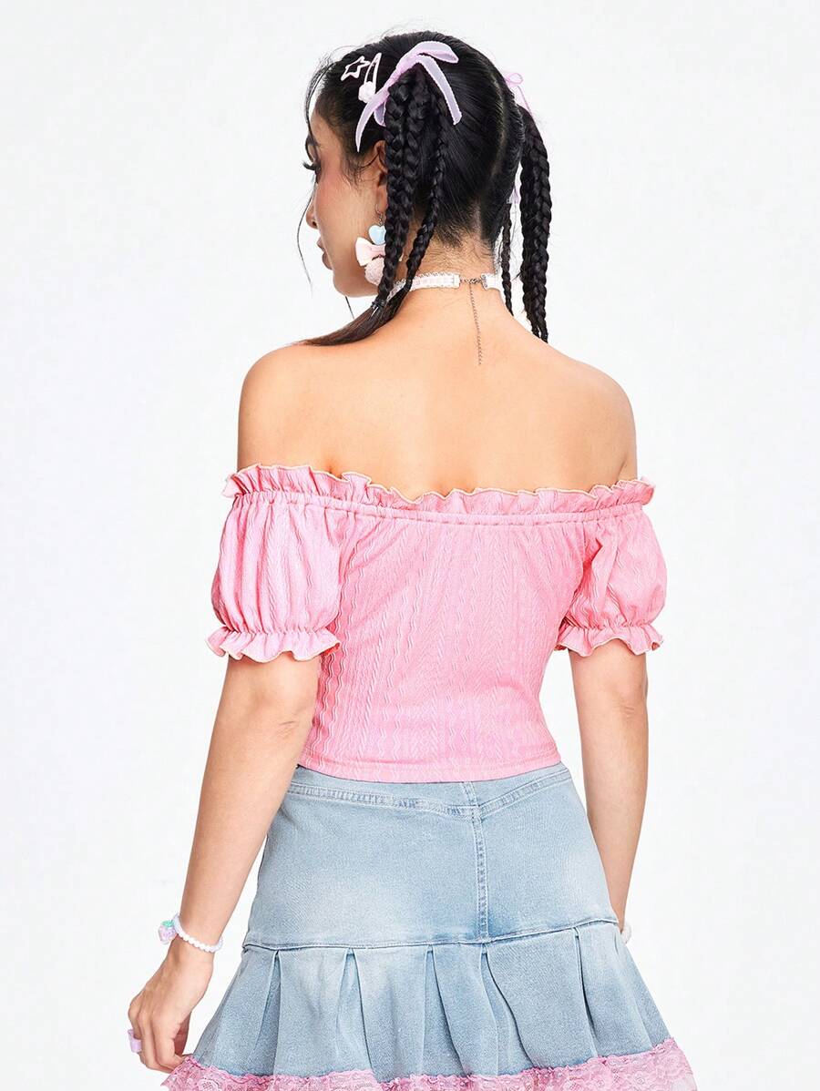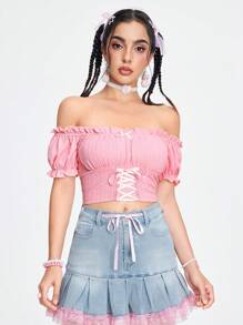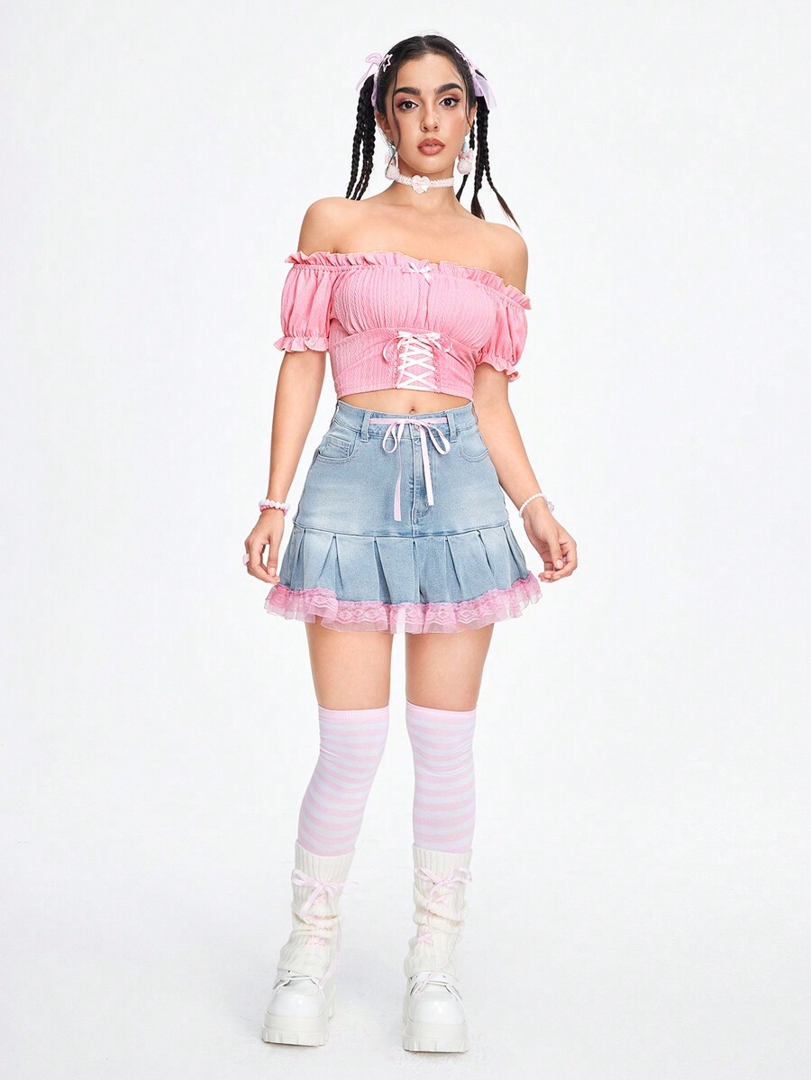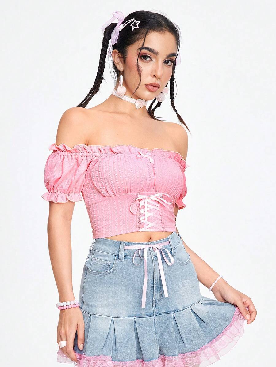 Kawaii Sommer-Oberteil für Frauen mit Crop-Ärmeln, Off-Shoulder, enganliegend, mit volantverziertem Saum und Schnürungs-Detail