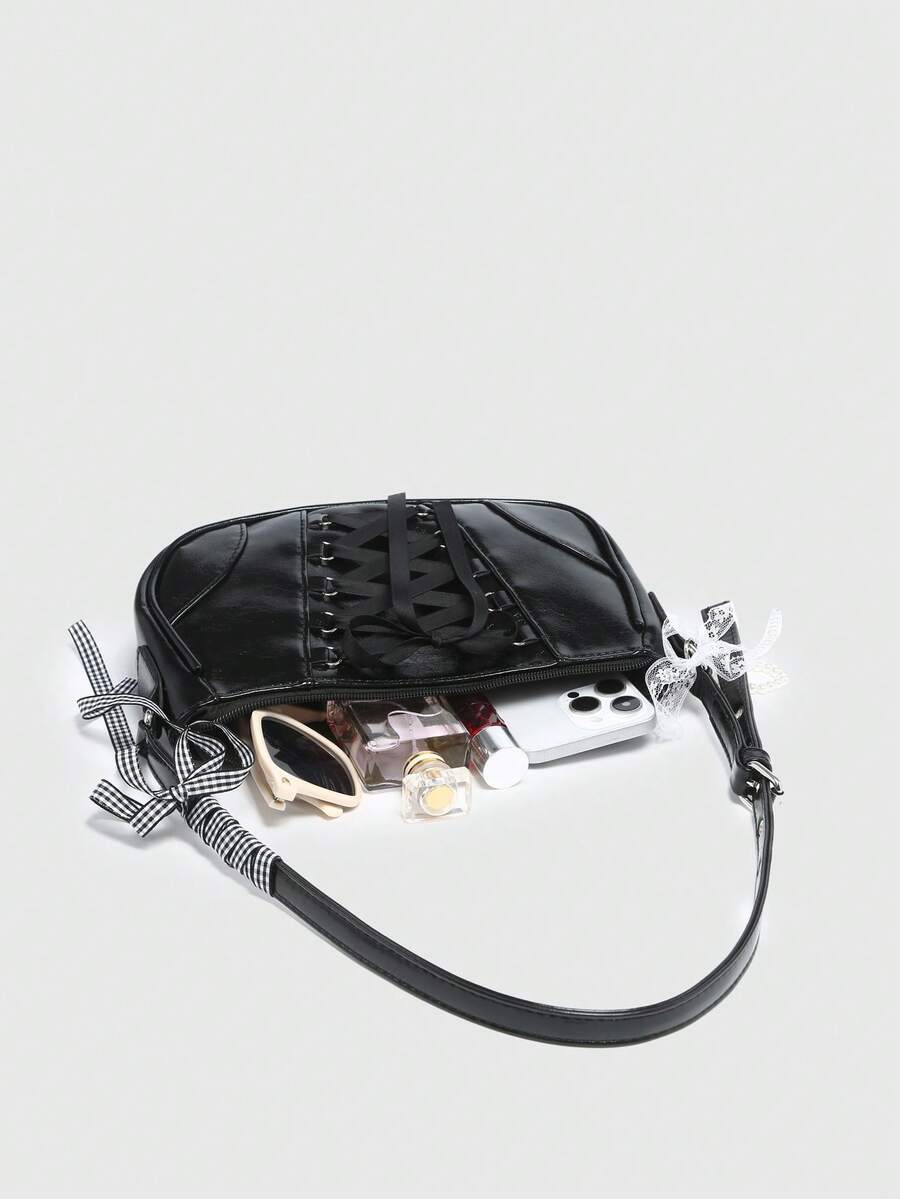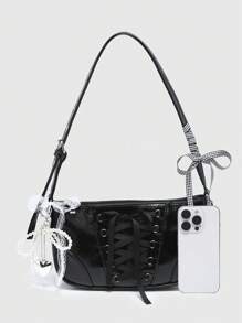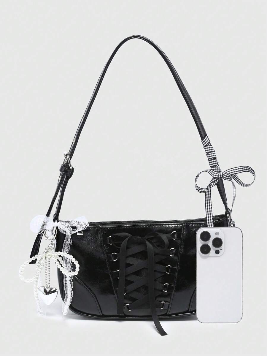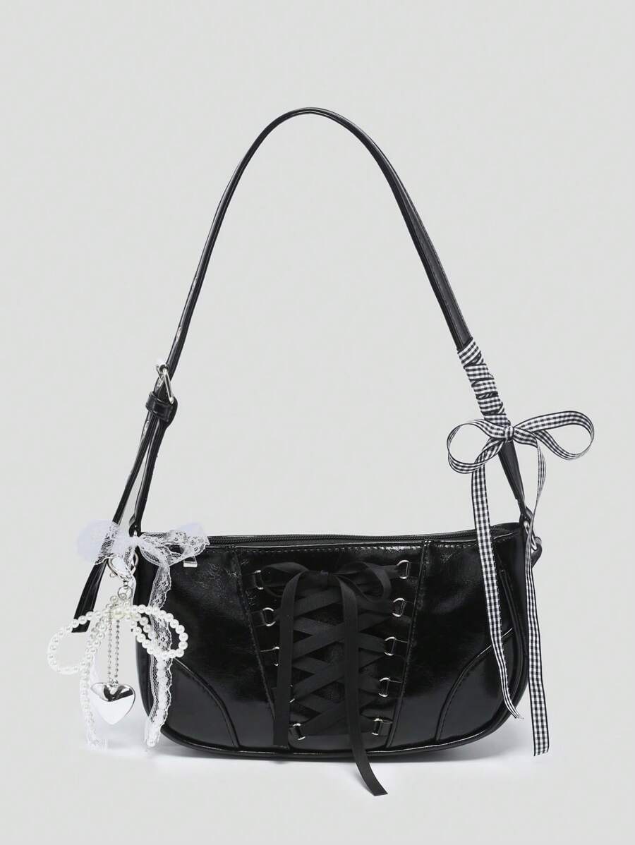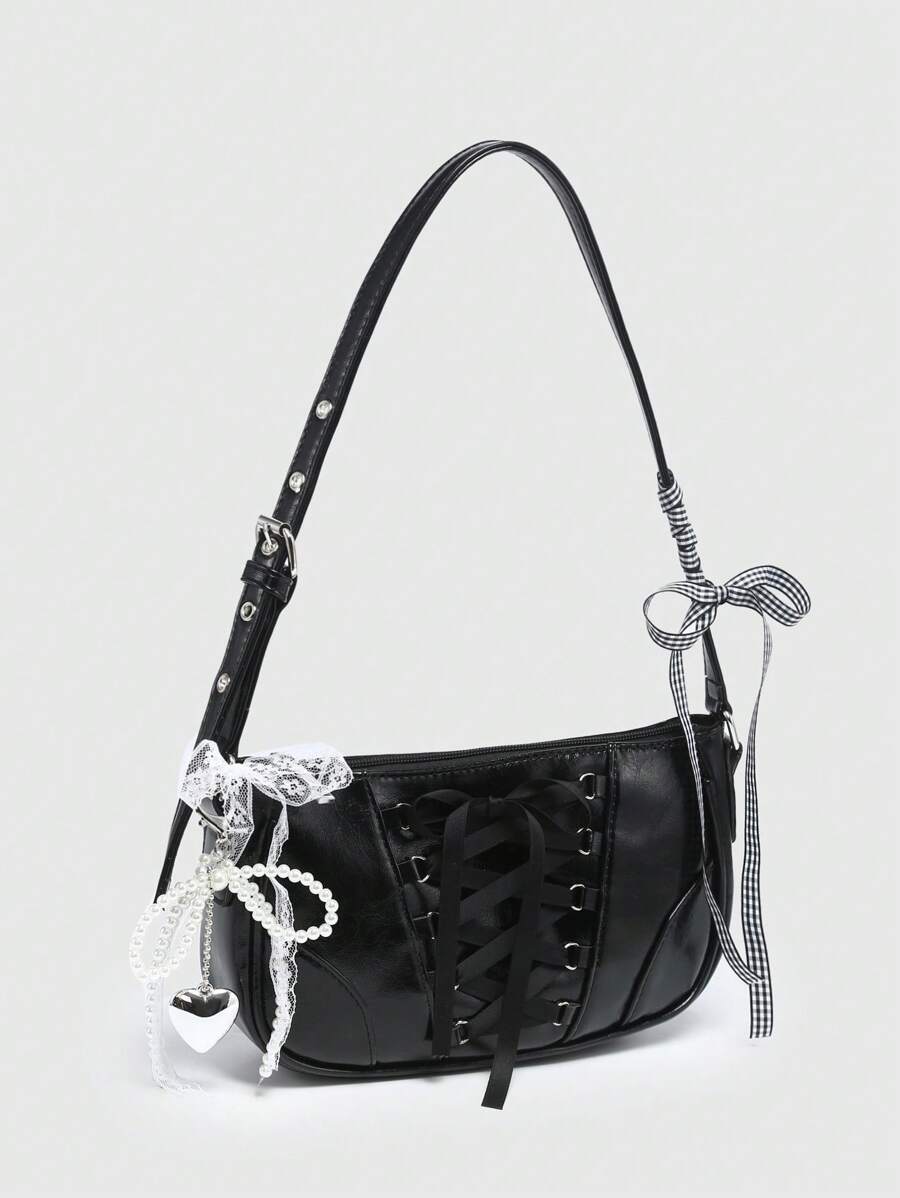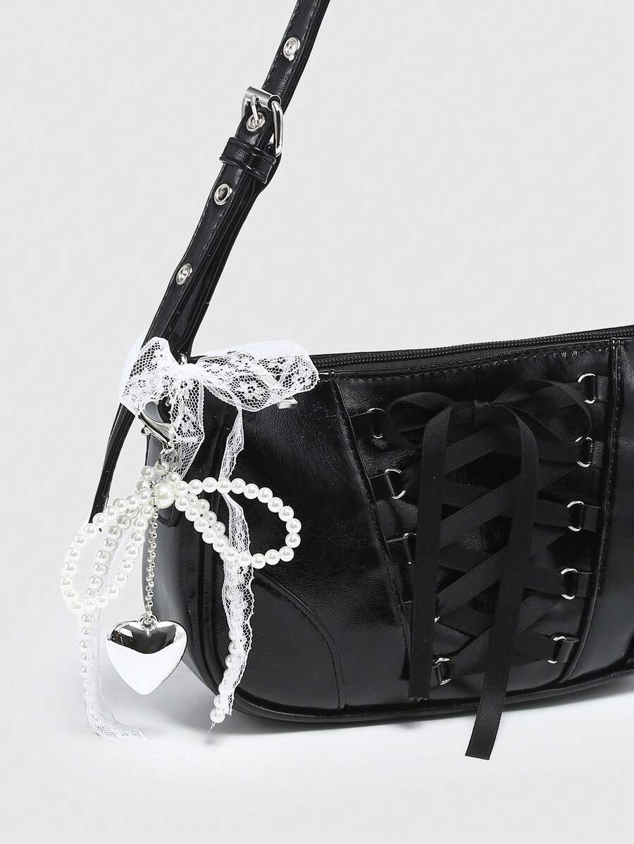 Kawaii Damen Vintage Ballett-Stil Schleife Ketten- & Perlen-Spitzen-Dekor Schulter-Unterarm Baguette Tasche