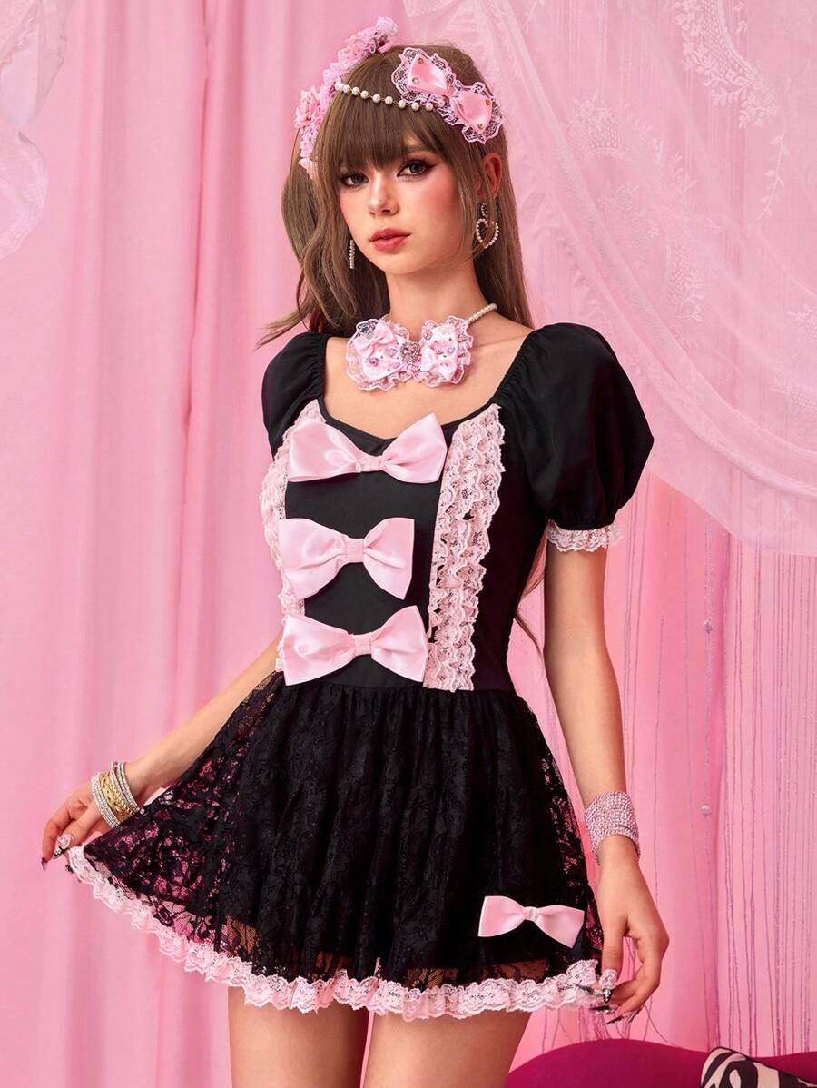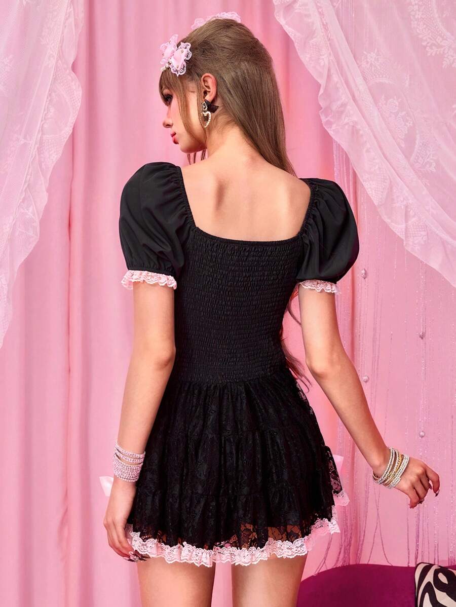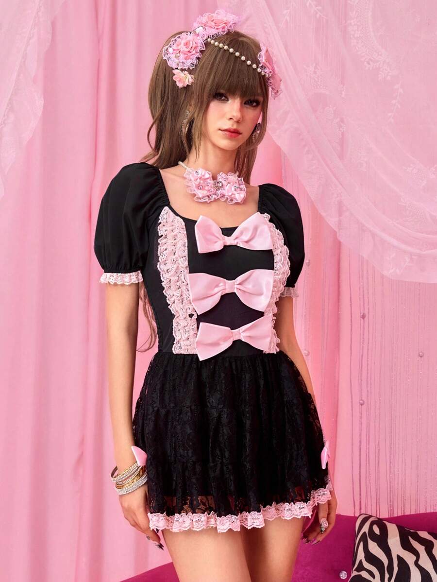 Kawaii Damen Y2K Gyaru Harajuku Puffärmel Spitze Patchwork Mini Kleid