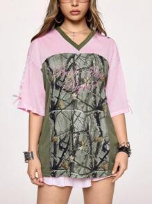 Kawaii Y2K Streetwear süß & scharf Camouflage bedrucktes Mesh V-Ausschnitt T-Shirt für Frauen