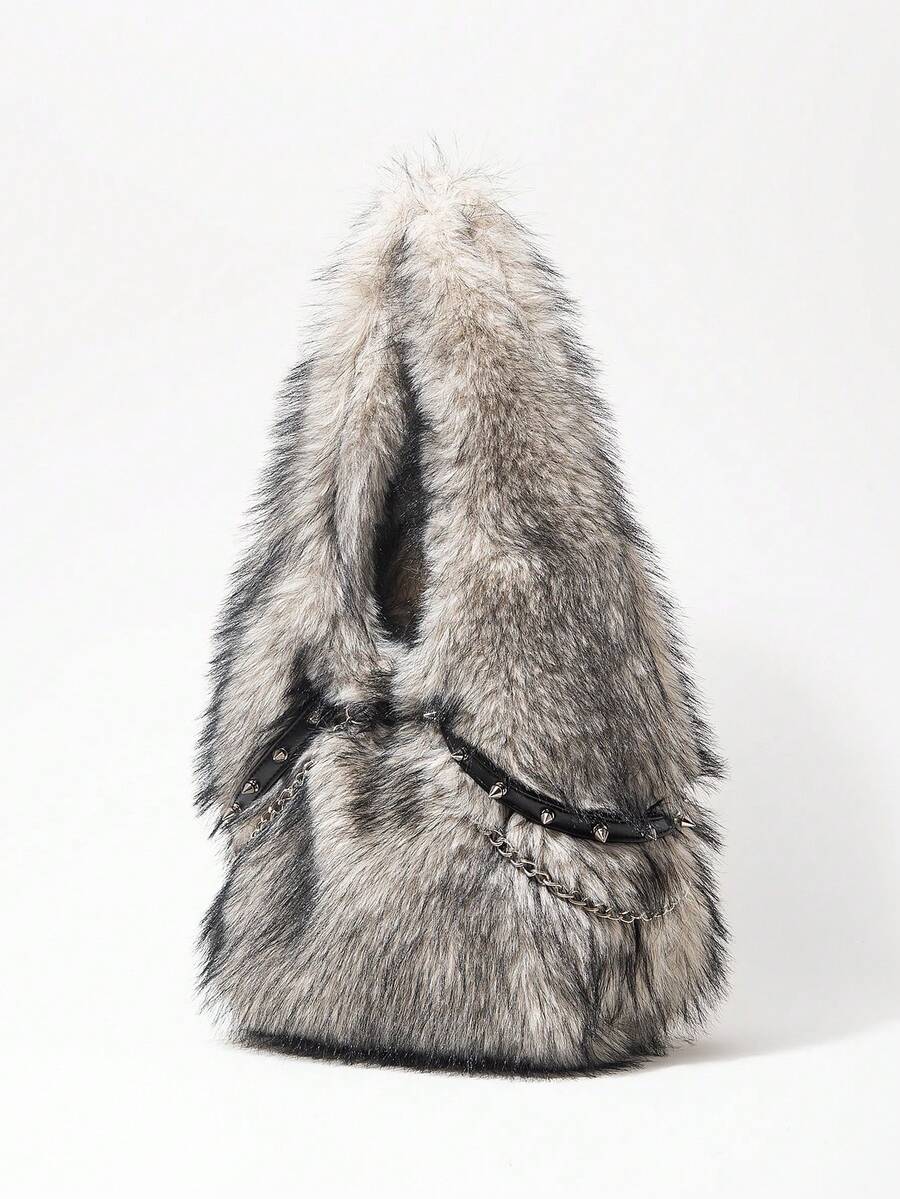 Grunge Punk Damen Umhängetaschen, Plüsch, Plüschtasche, Punk Nieten Bikertasche, Hobo Tasche, Burgunderrote Tasche, Weihnachtstasche, Geschenke für Frauen, Valentinstag, Metallkette, modisch, personalisiert, vielseitig, Einkaufen, Straße, süße und coole Mädchen, heiße Mädchen, Y2K, Alltag, Herbst und Winter (zufälliges Muster)