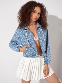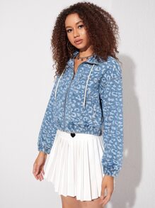 Jeansjacke mit Leopard Reißverschluss, Tunnelzug, Kapuze
