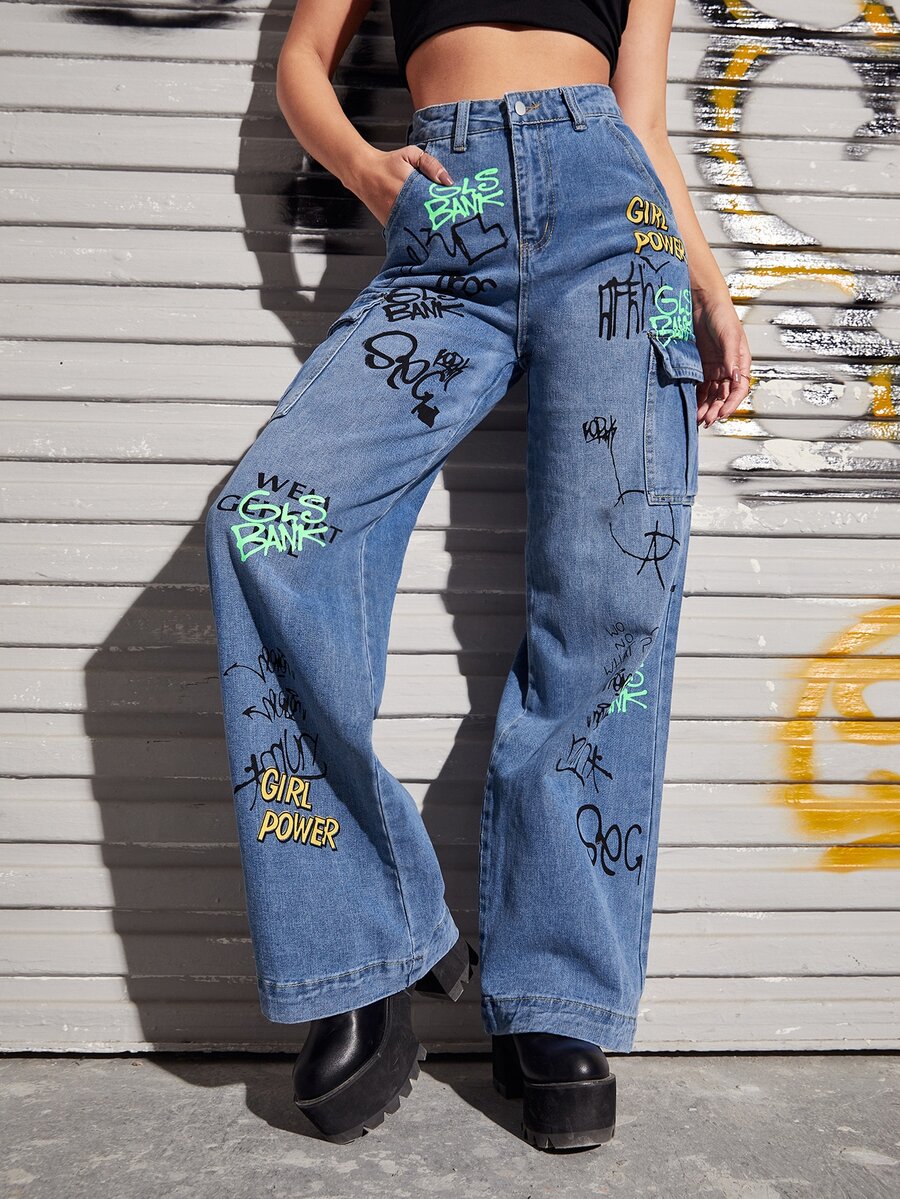 Jeans mit Buchstaben & Grafik Muster und weitem Beinschnitt