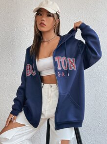 Hoodie mit Buchstaben Grafik, Reißverschluss, Drop Shoulder Tunnelzug, Thermal Futter