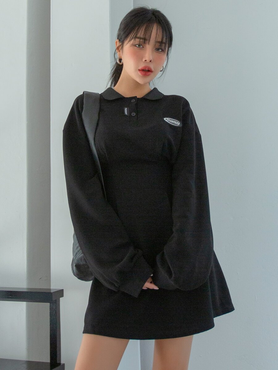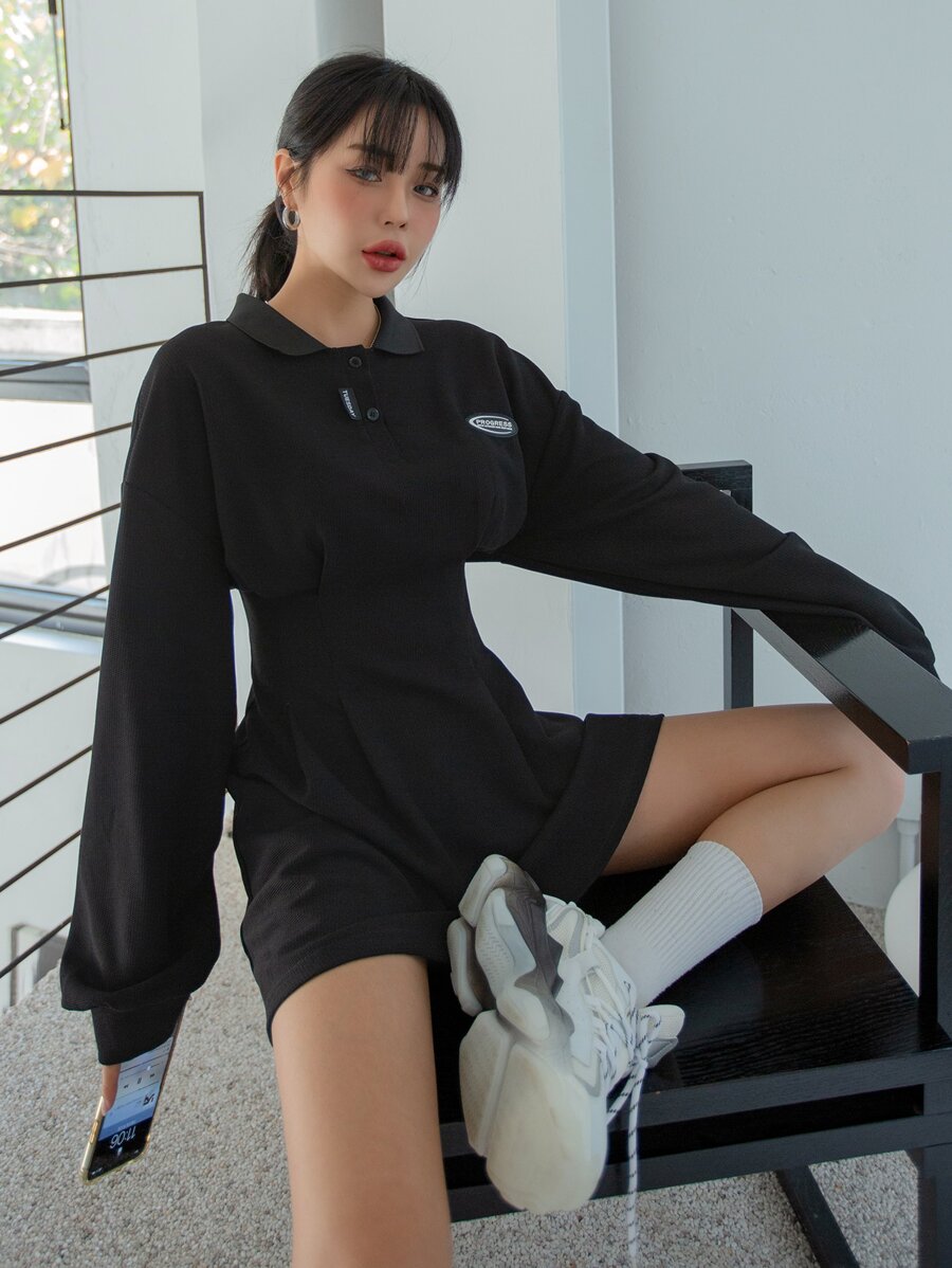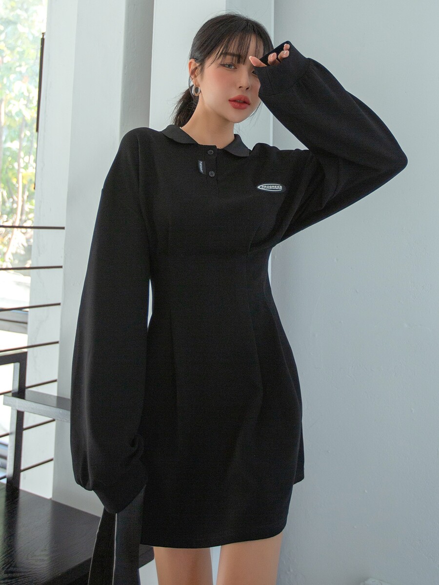 Kleid mit Buchstaben Flicken Detail, Oversized-Schultern und Polokragen, Lässig Damen Kleid, Langarm Kleid für den Herbst