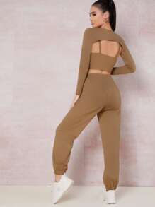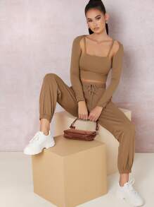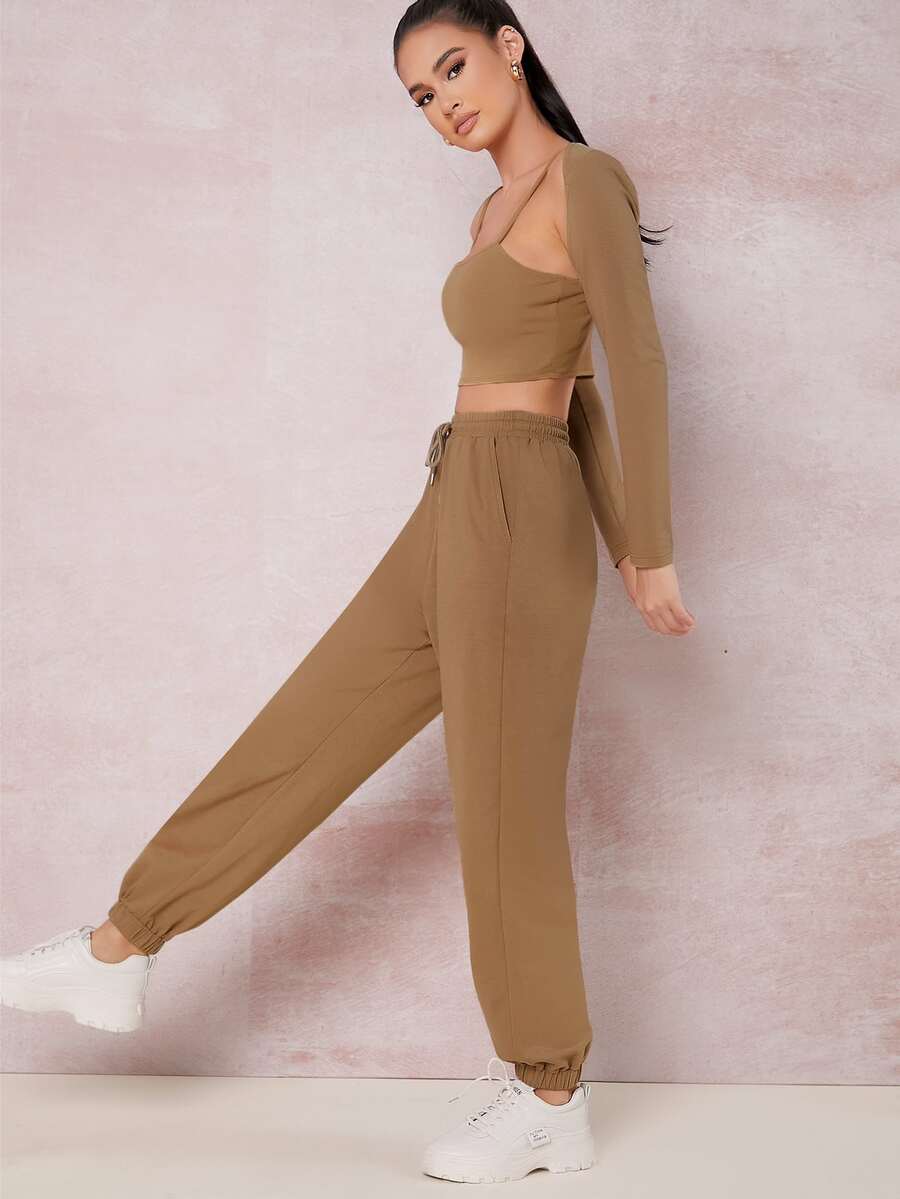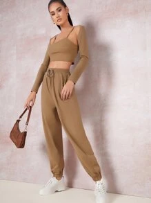 Einfarbiges Crop Cami Top & Jogginghose mit Schnürung-Taille und Cape
