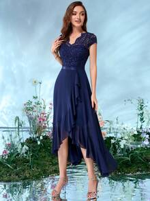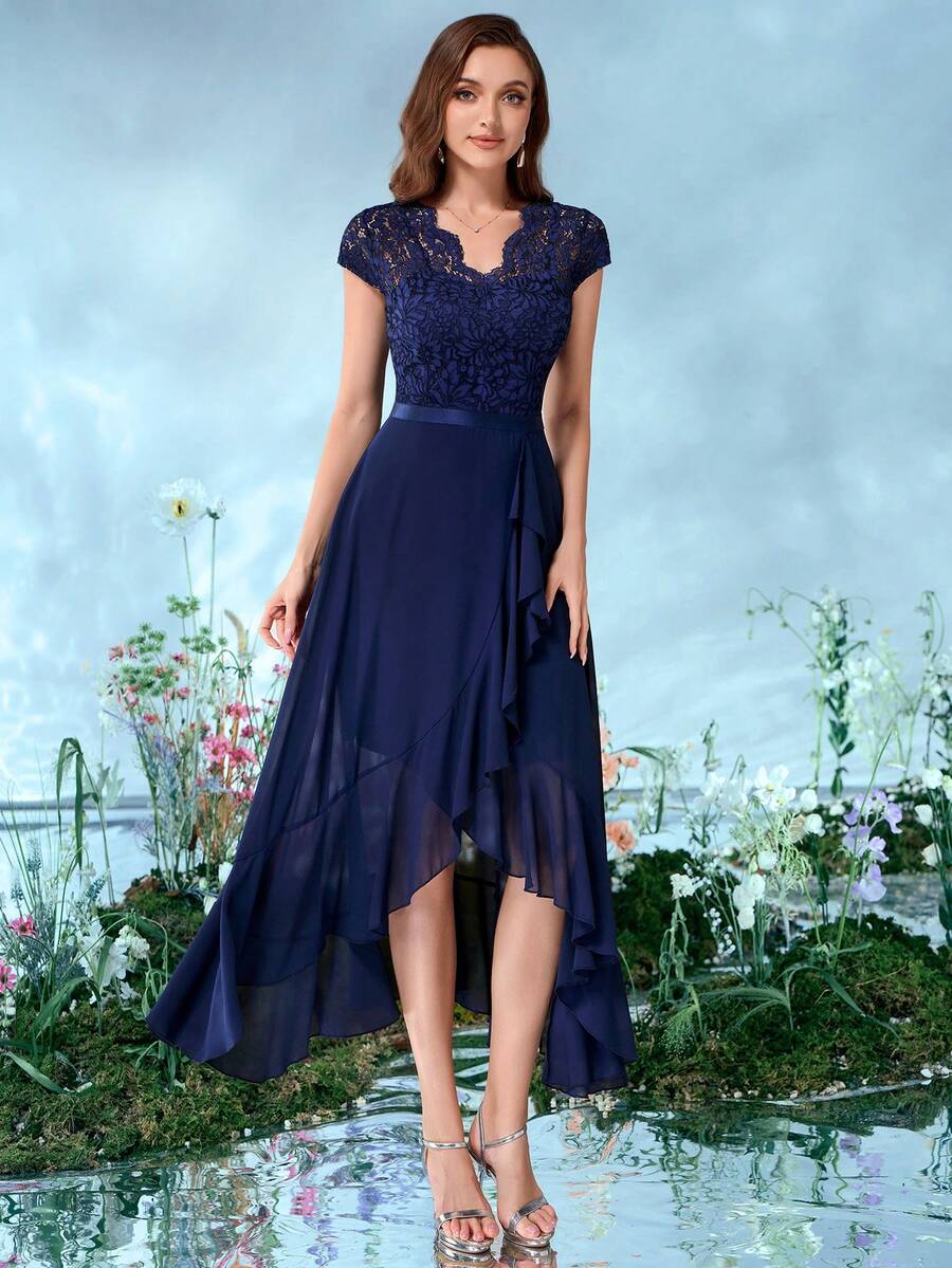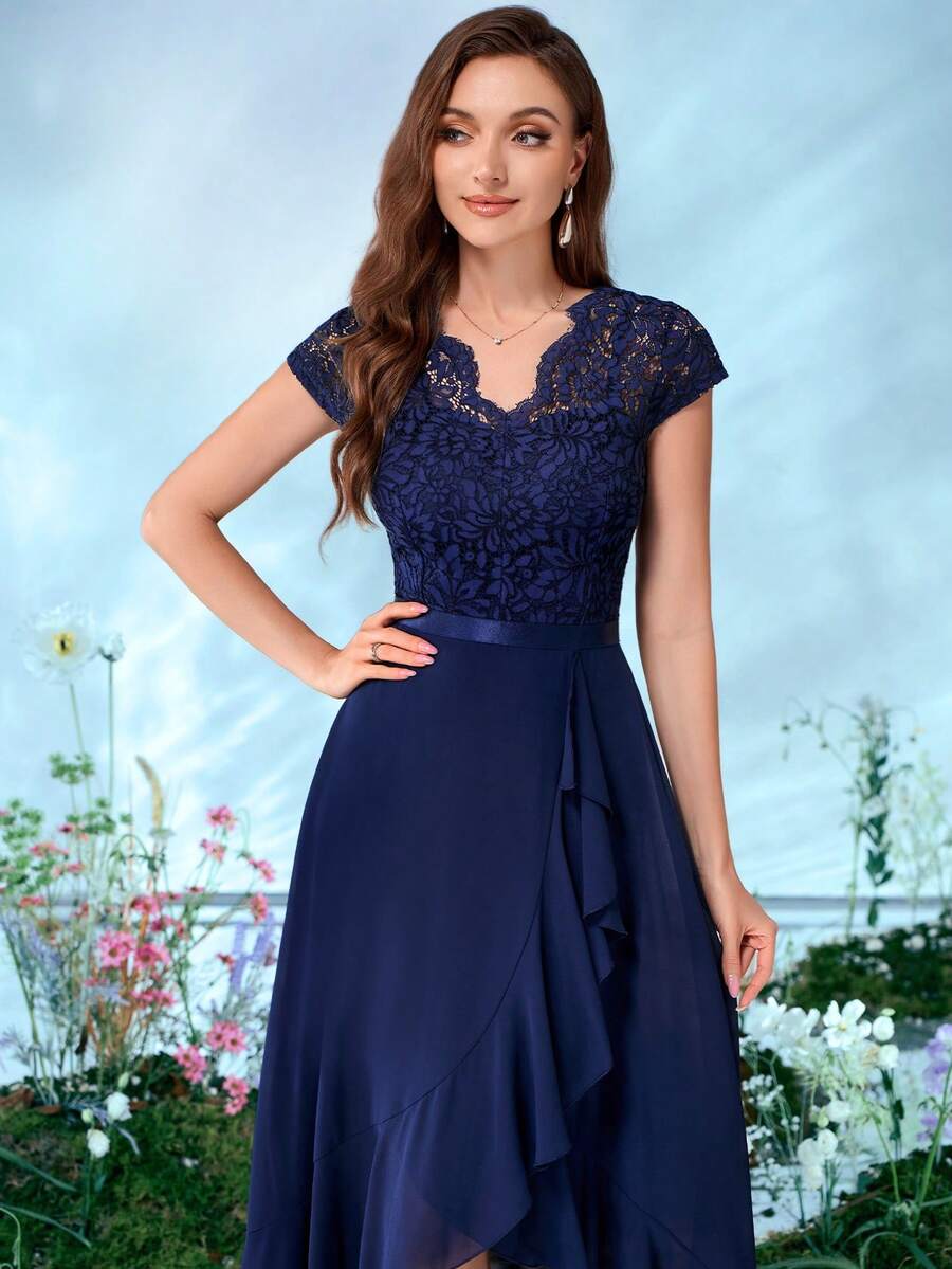 MIUSOL Abendkleid mit V-Ausschnitt, Blumen Spitze, Rüschen Saum und Chiffon für Partys