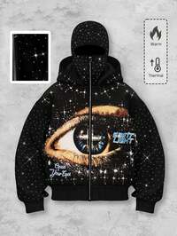 Street Life Herren Lässig Streetwear Hoodie mit Buchstaben- und Ziffern-Strass-Muster, Reißverschluss vorne, Kordelzug