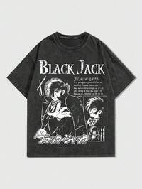 Black Jack X ROMWE Herren Lässig T-Shirt mit Cartoon-Motiv und Slogan-Grafik, verwaschen, weite Passform, Sommer