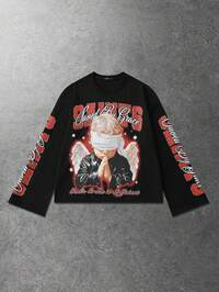 Anime Herren Lässig Langarm T-Shirt mit Buchstaben-Muster, Rundhalsausschnitt, weite Passform, Herbst