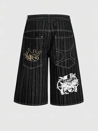 Goth Herren Lässig Alltags Shorts mit Kreuz-Stickerei und Kordelzug Taille, Sommer