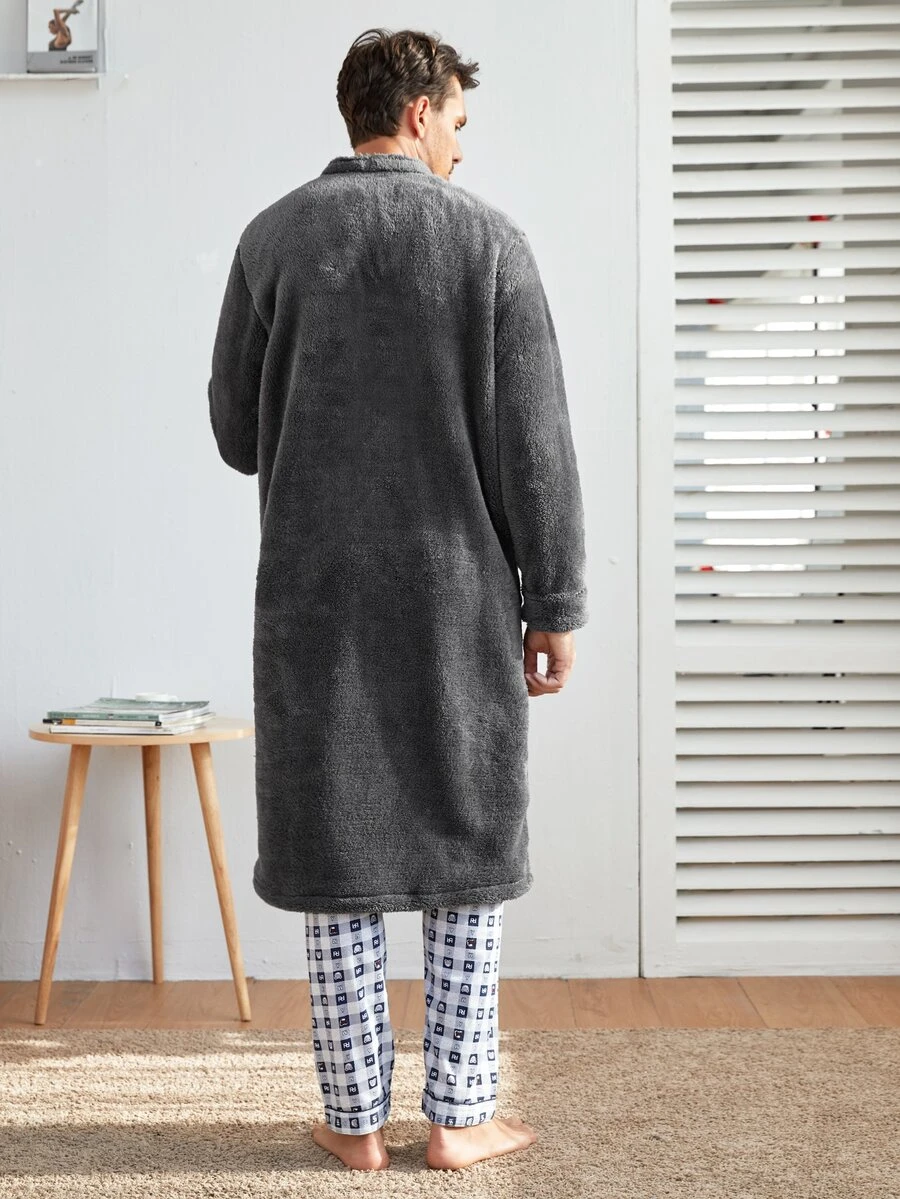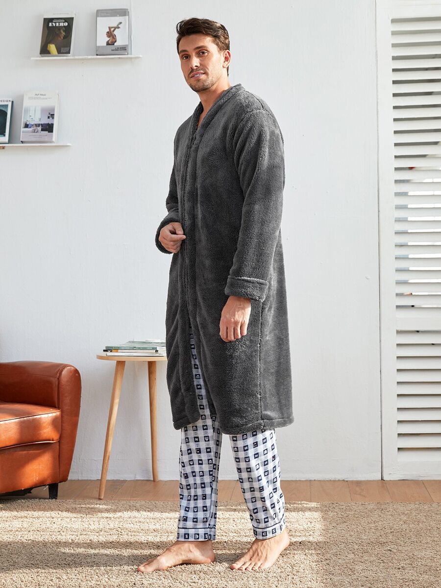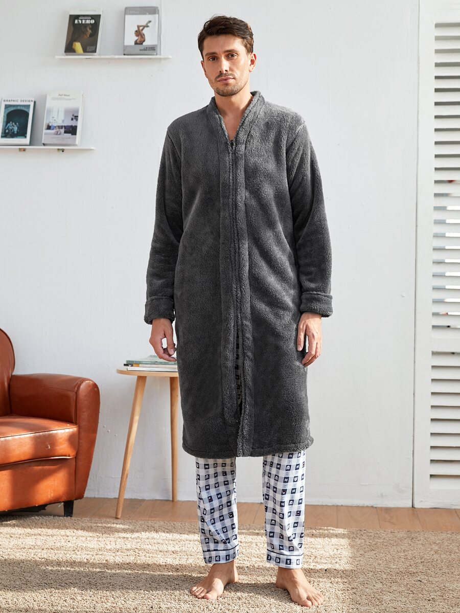 Einfarbiger Flanell Hausmantel mit Reißverschluss vorne