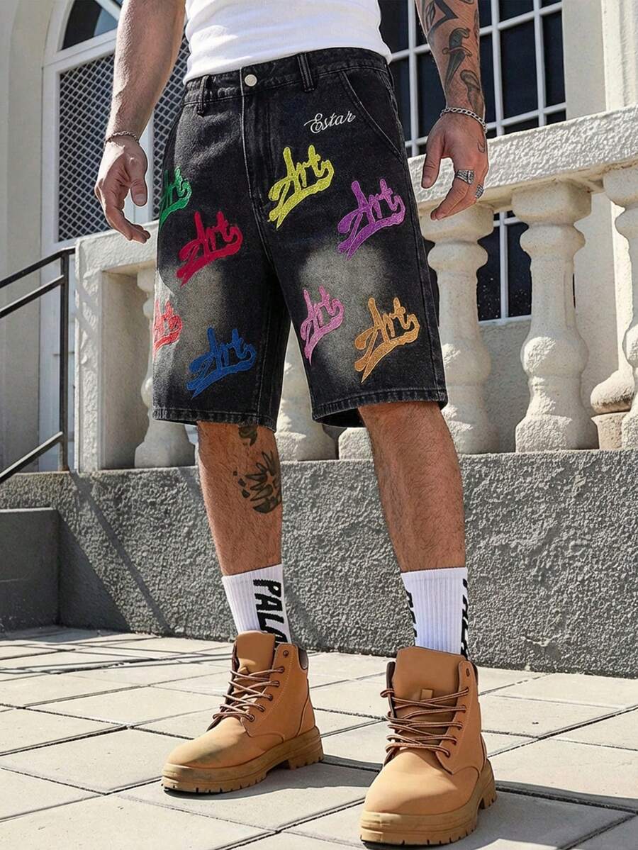 Herren Lässig Alltags Denim-Shorts mit Taschen und Knopf Buchstaben Grafik