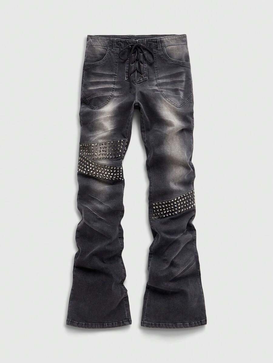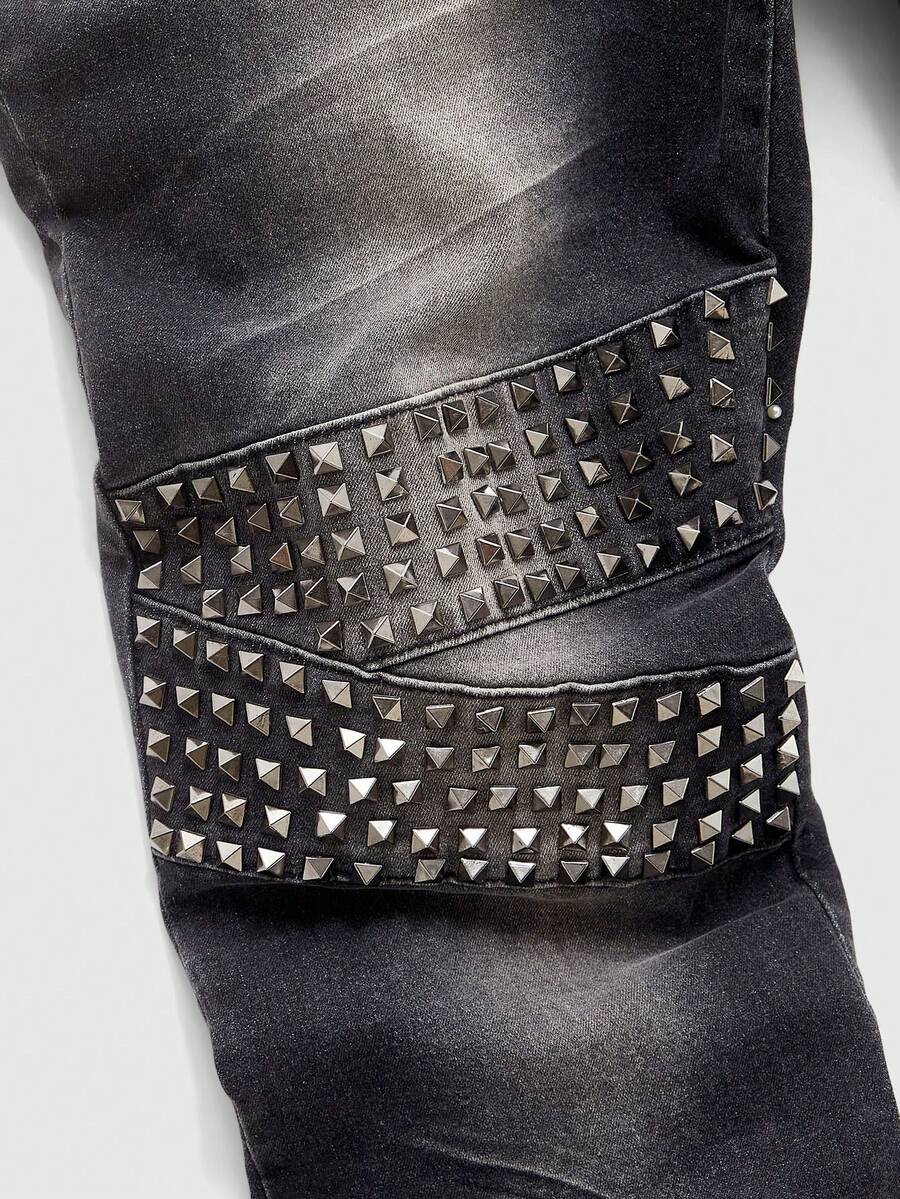Herren Lässig Fashion Street Punk Metall Nieten Layered Verwaschen Weite Jeans