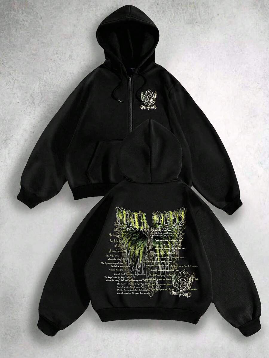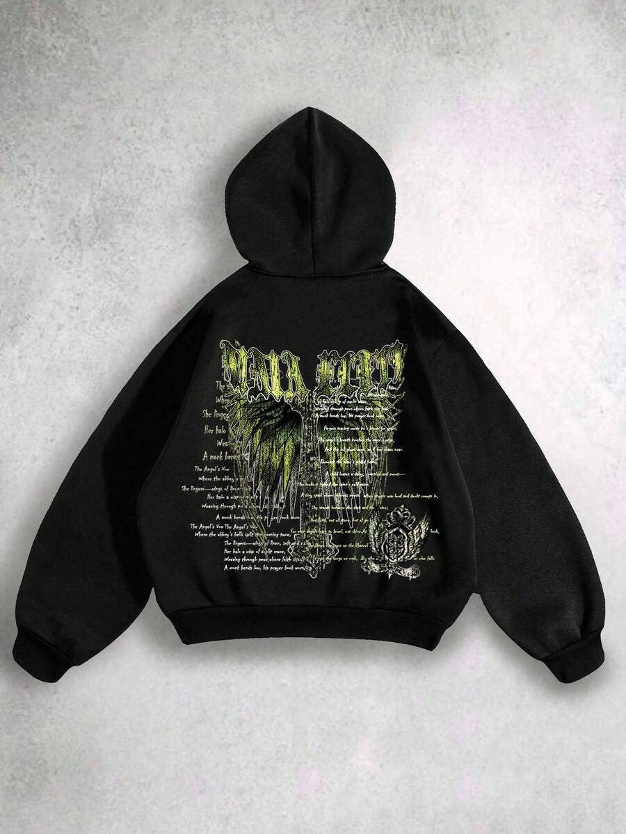 Goth Herren Fleece Hoodie mit grünem Federfügel Slogan Aufdruck, Herbst/Winter