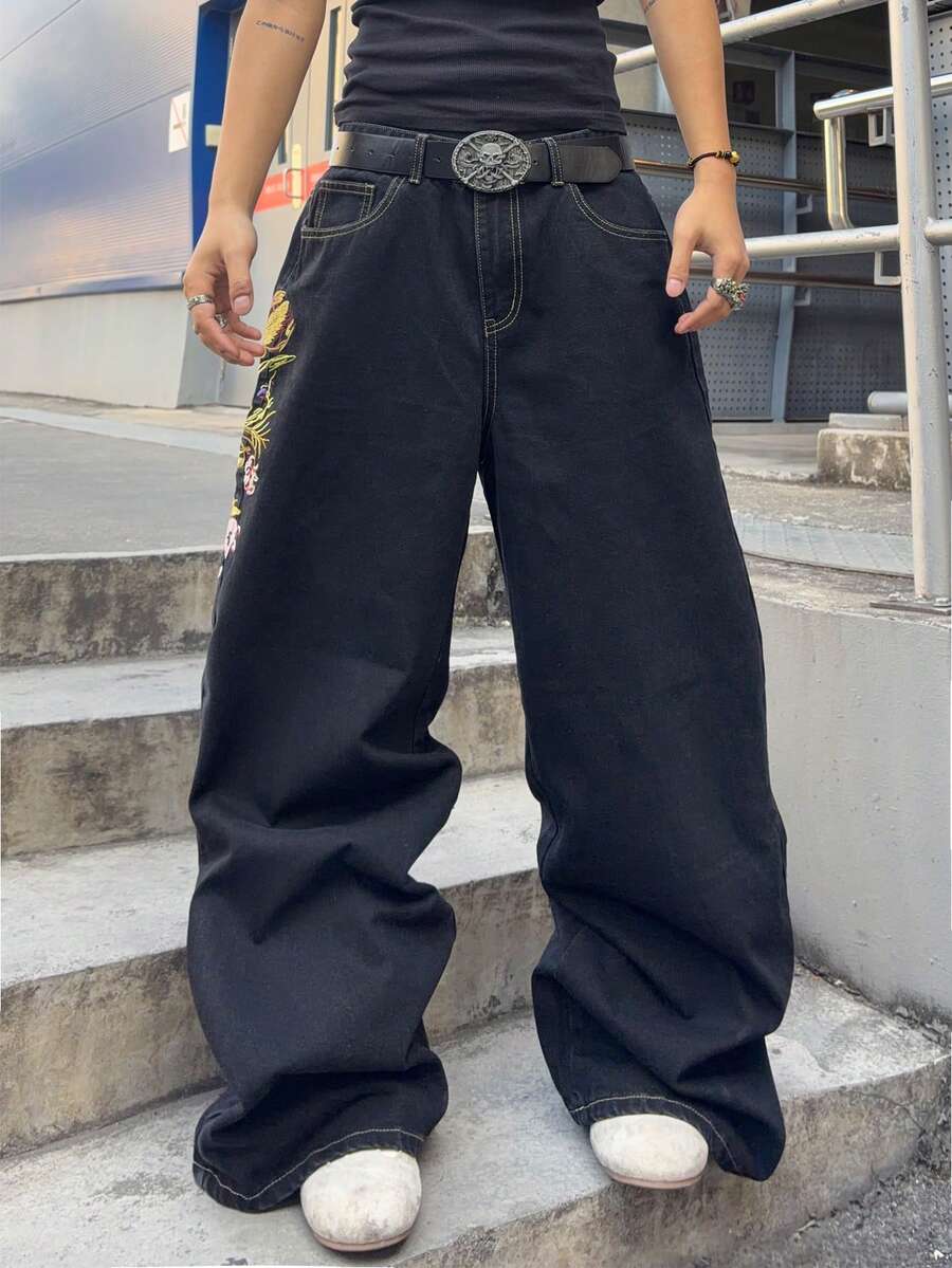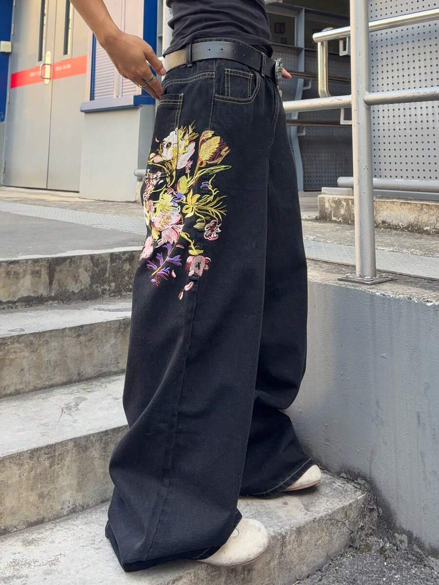 Herren Jeans mit weitem Bein, locker geschnitten, mit floraler Stickerei auf der Tasche