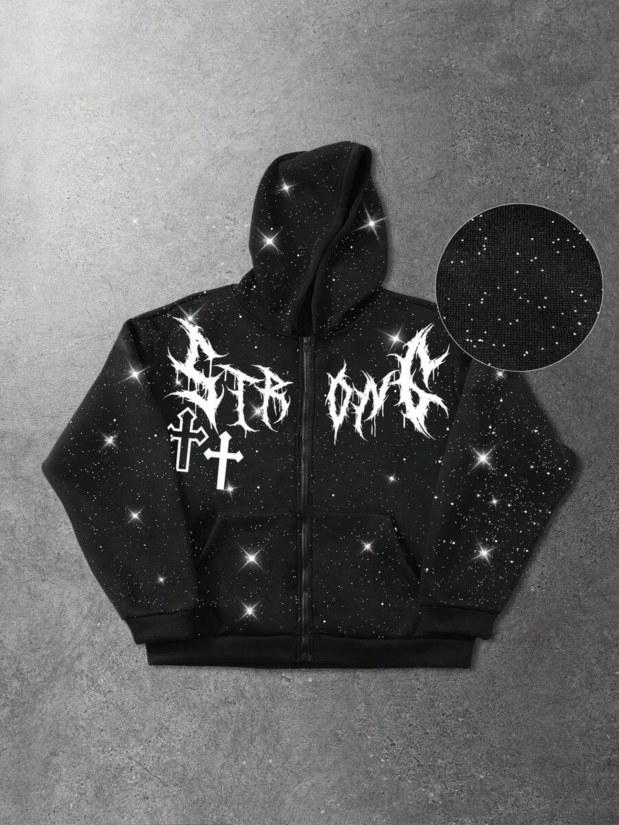Herren Langarm Hoodie Sweatshirt mit Buchstaben- und Kreuz-Muster, Reißverschlusskragen, Tasche, glänzend