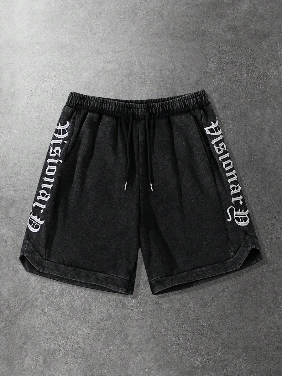 Herren Shorts mit Buchstaben-Stickerei Muster, Kordelzug Taille, Lässig Verwaschen