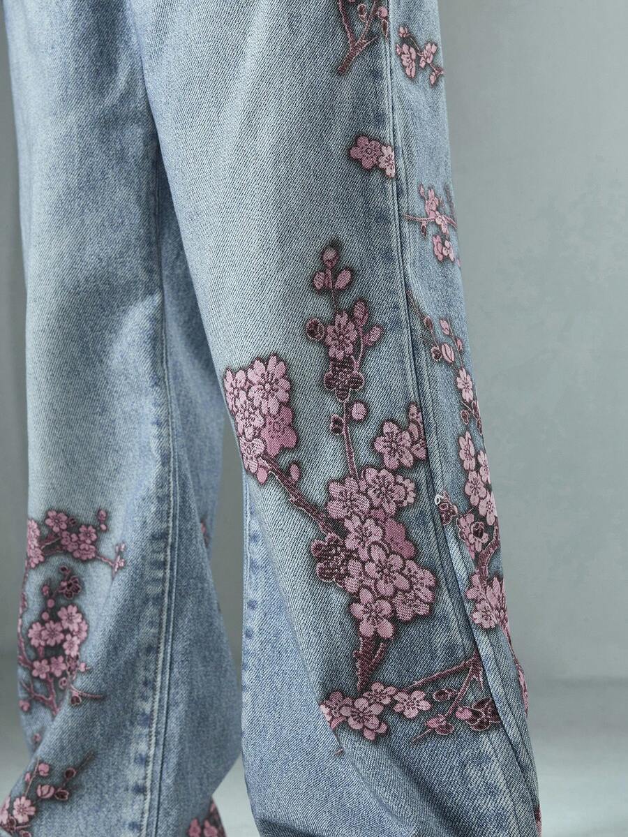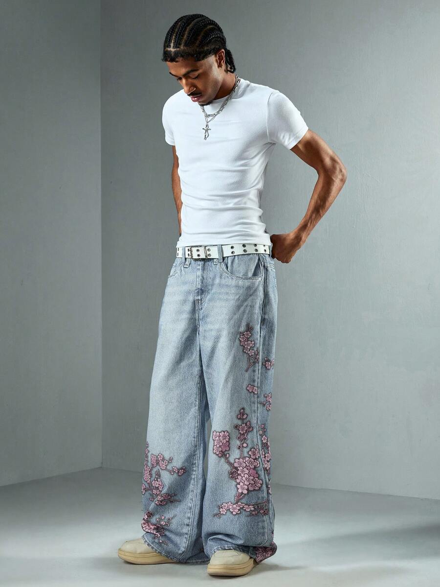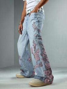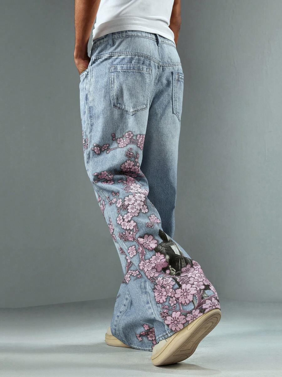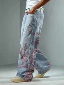 Anime Herren Loose Fit Jeans mit weitem Bein und Blumenmuster, Streetwear Stil