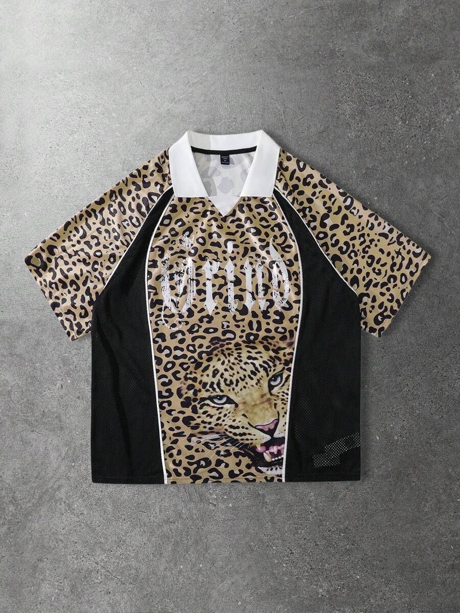 Herren Raglan Ärmel Lässig Halb-Reißverschluss Leoparden Muster Poloshirt