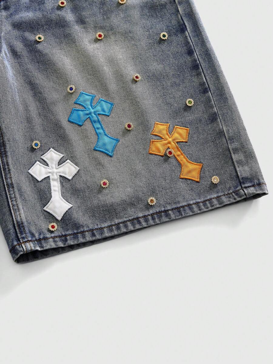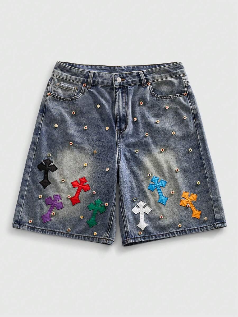 Herren Denim Shorts mit Strass-Kreuz-Stickerei