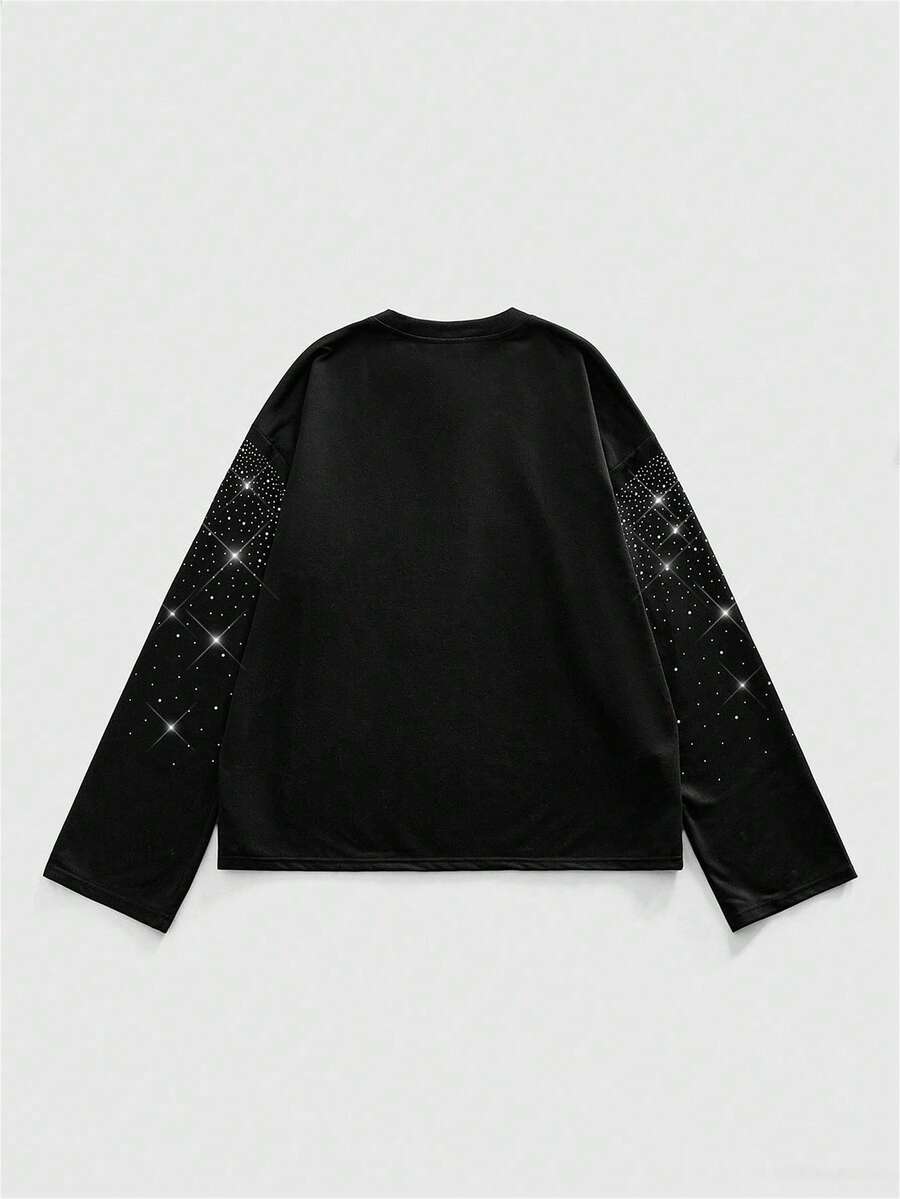 Herren Strass verziertes grafisches Loose Fit Rundhals Langarm T-Shirt, geeignet für den täglichen Gebrauch, Frühling/Sommer