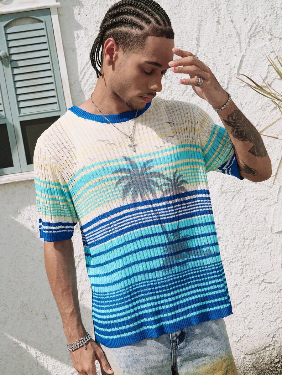 Herren Rundhals Kurzarm Farbverlauf Palmen Muster Strickpullover