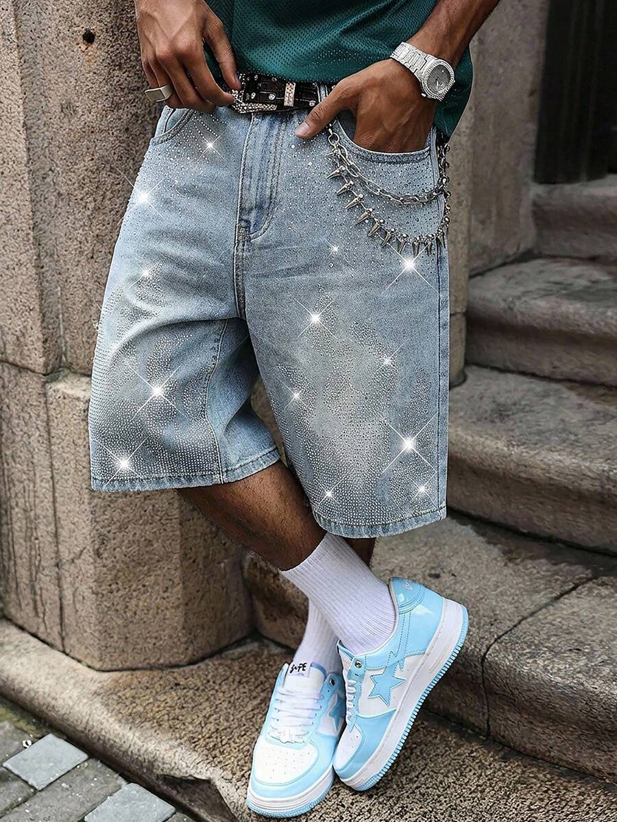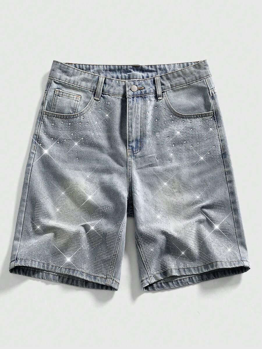 Herren Sommer Lässig Jeans Shorts mit Strass Verzierung