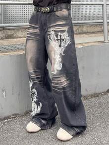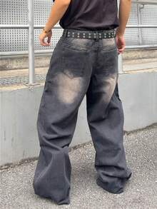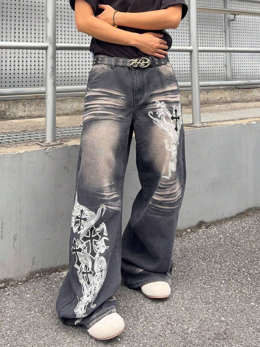 Herren-Jeans mit gewaschenem, besticktem Muster, lockerem Schnitt und Baggy-Style