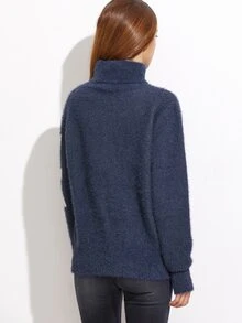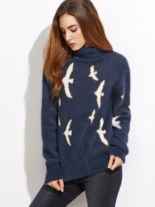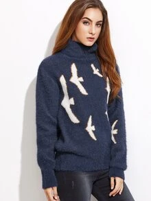 flauschige Pullover Rollkragen Vogel Muster-marine