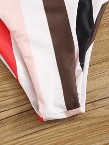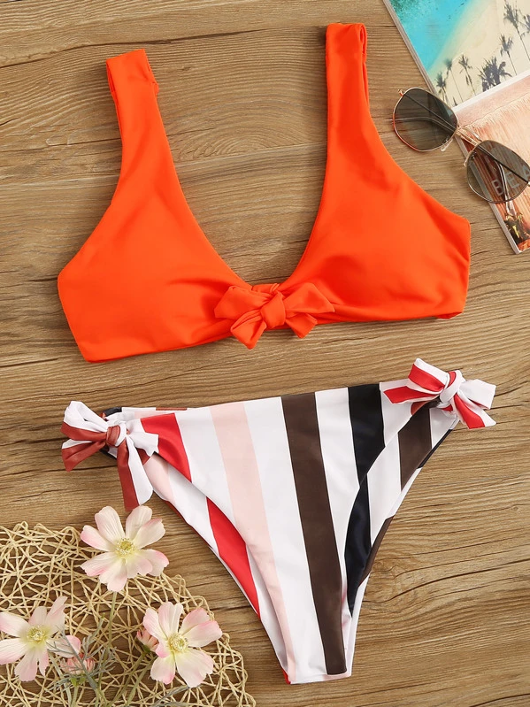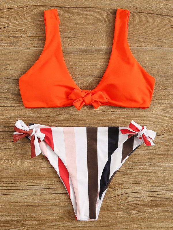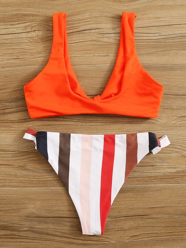 Neon Orange Top und Bikini Set mit Streifen Band auf den Seiten