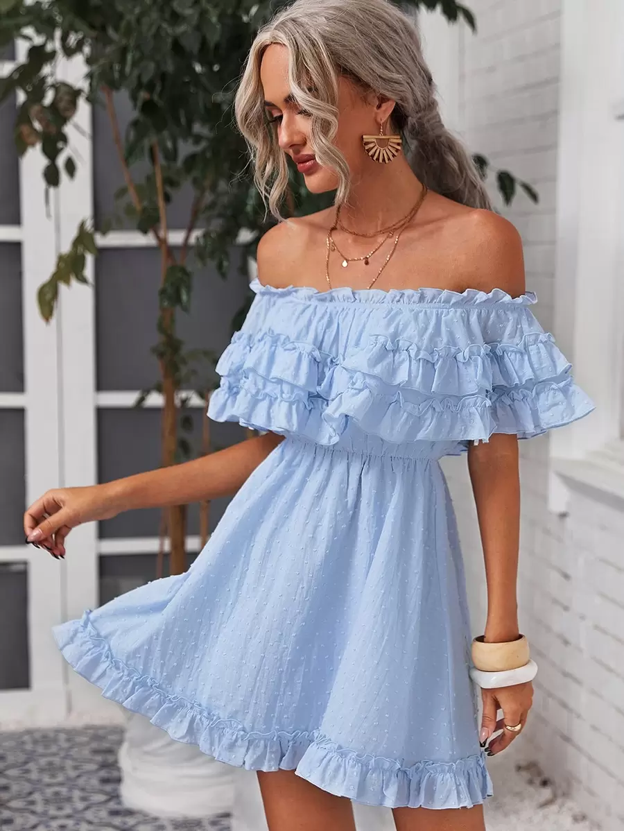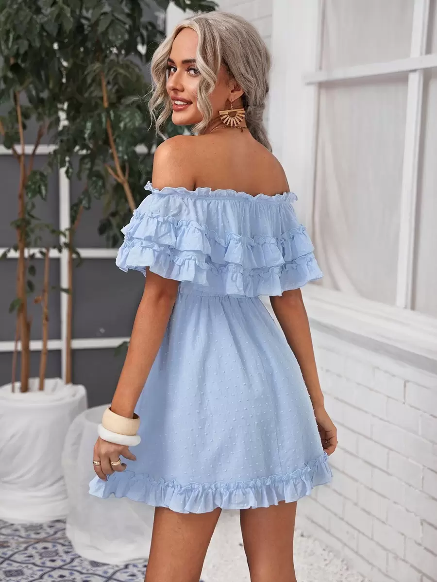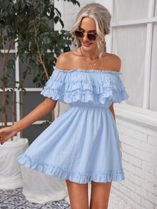Schulterfreies Kleid mit mehrschichtigen Rüschen und Punkten Muster