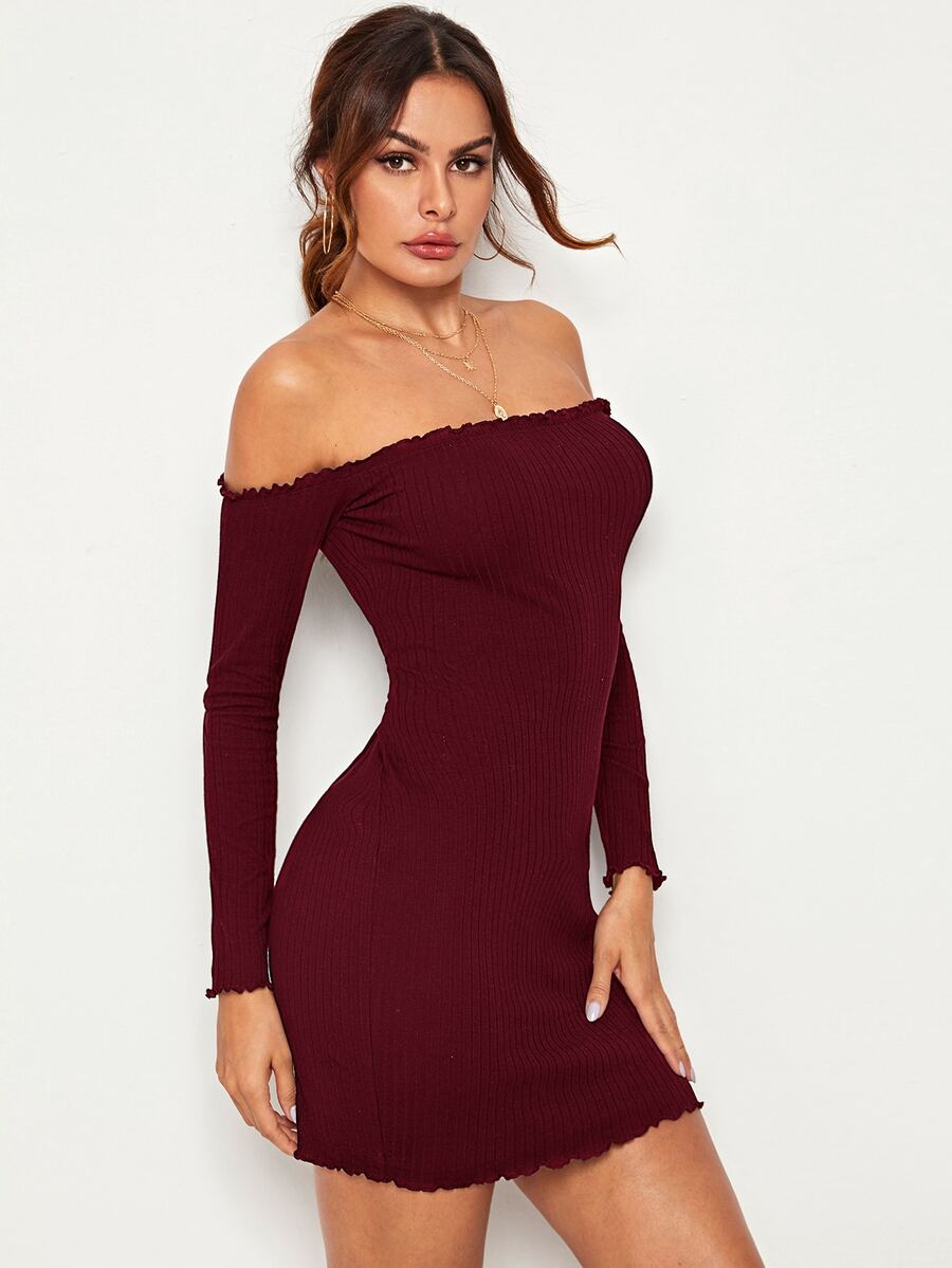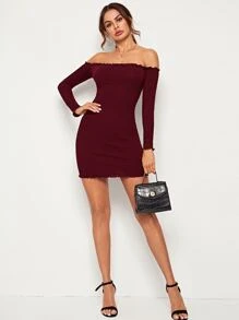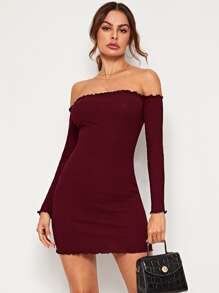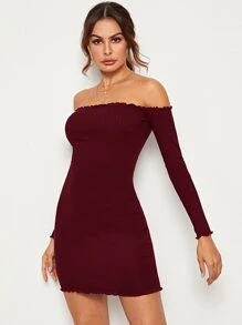 Schulterfreies Strick Kleid mit gekräuseltem Saum