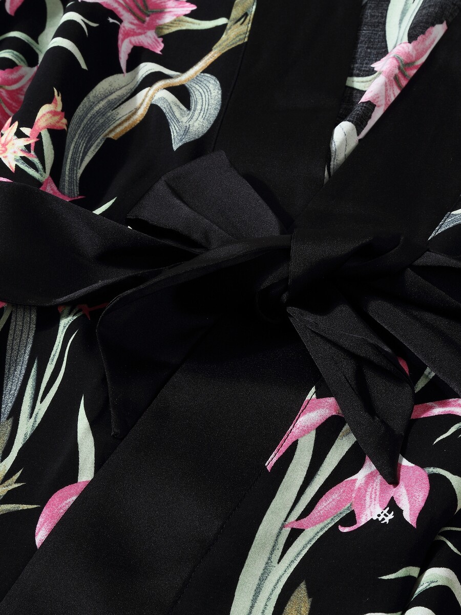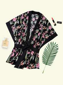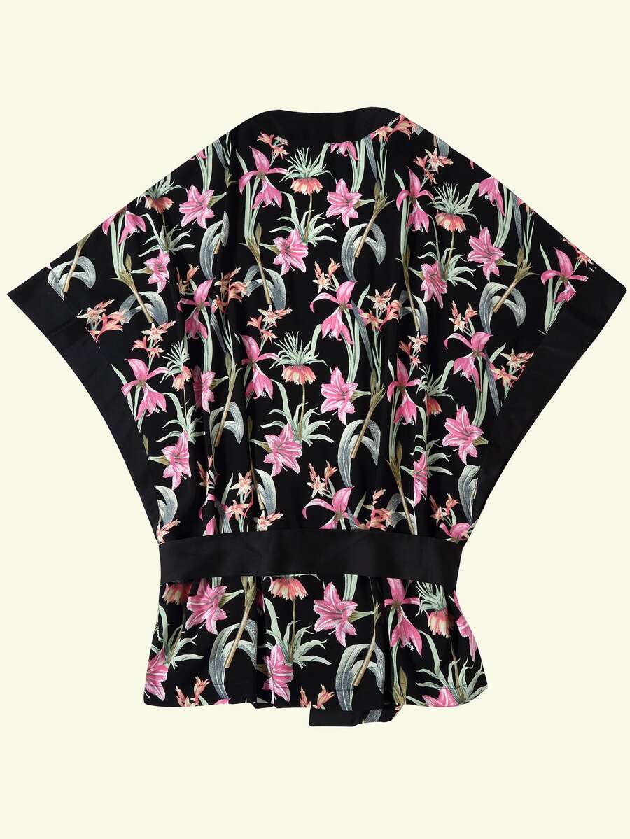 PLM Hausmantel mit Fledermausärmeln, Gürtel und Blumen Muster