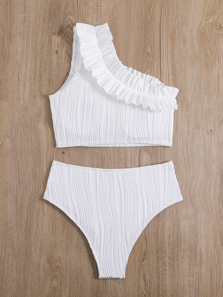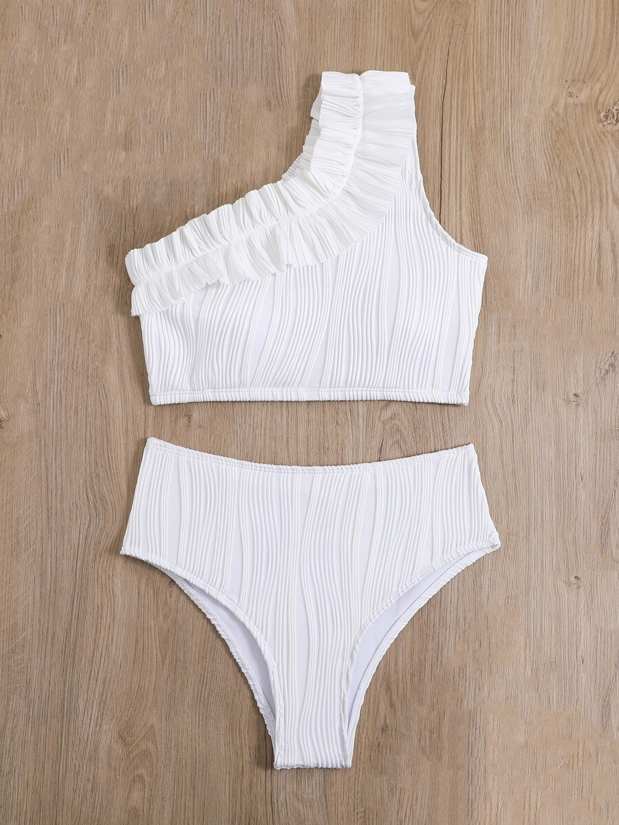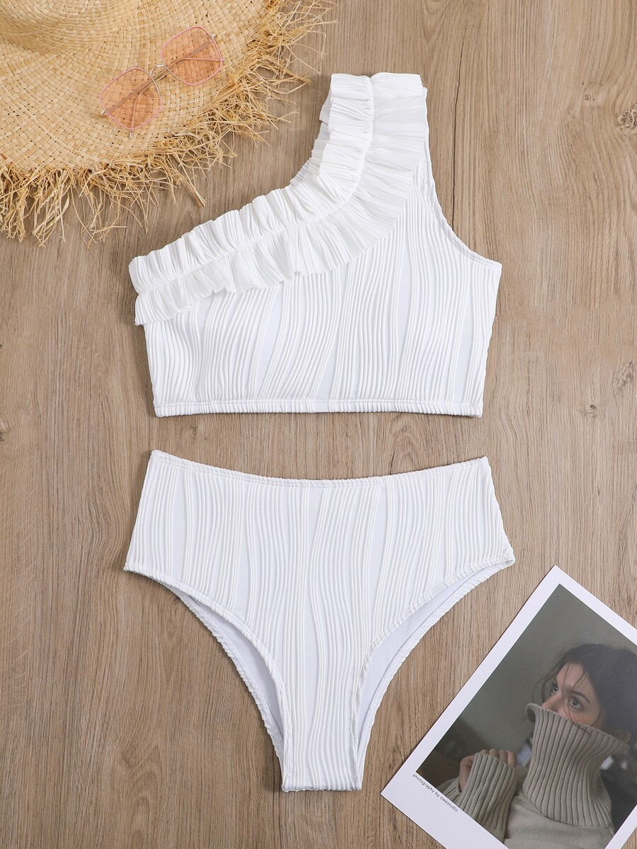 Einfarbiges Rüschen Trim One Shoulder Bikini Set für den Sommerstrand