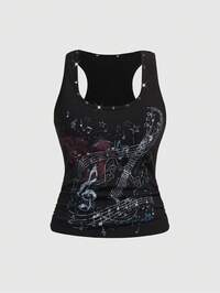 Grunge Punk Damen Große Größen Musikalische Note Muster Lässig Rundhals Mode Trägerhemd