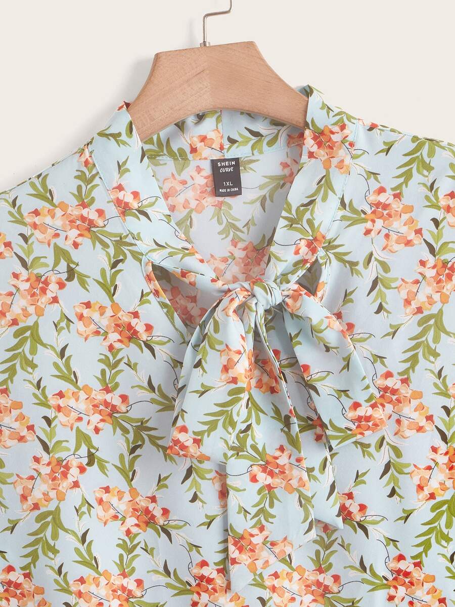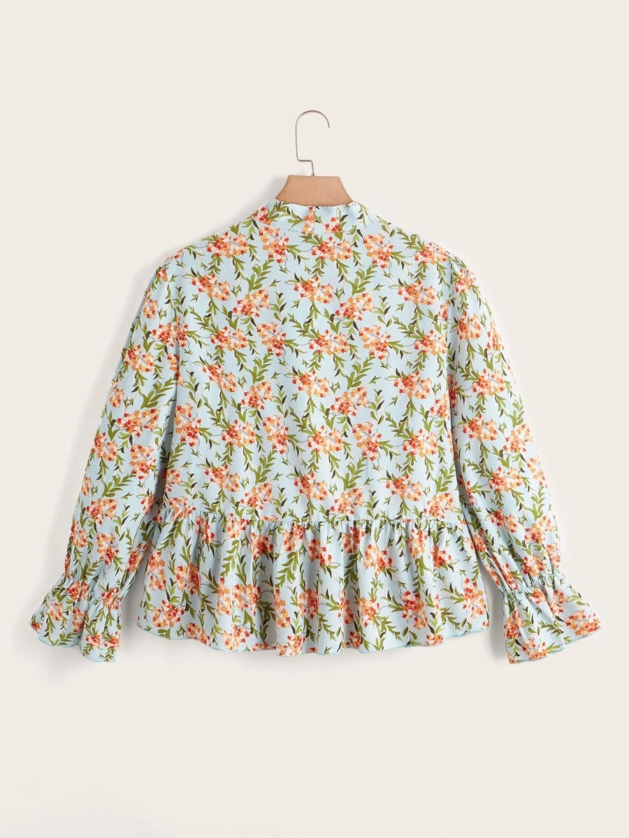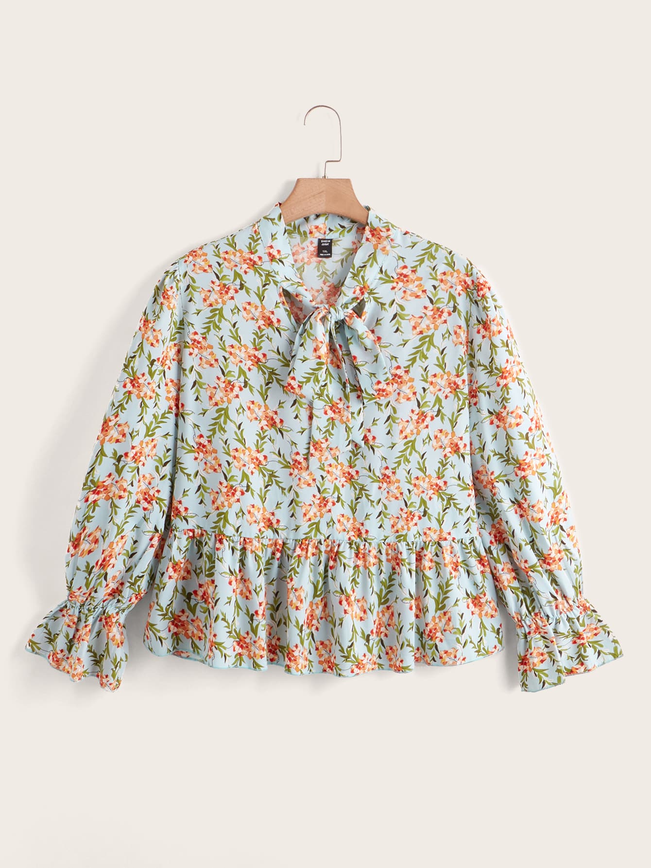 Komplett bedruckte Schößchenbluse mit Blume Muster, Schleife am Ausschnitt, Volant Ärmeln