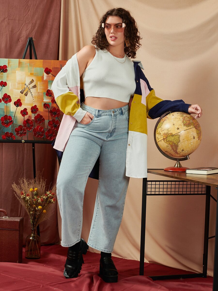 Drop Shoulder Bluse mit Farbblock und Tasche Flicken