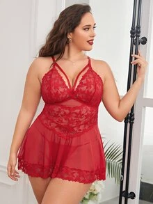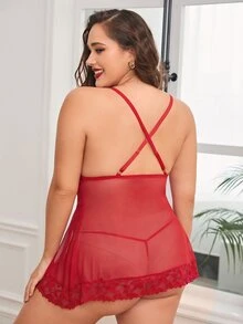 Negligee mit Kontrast Spitzen, Mesh & Tanga