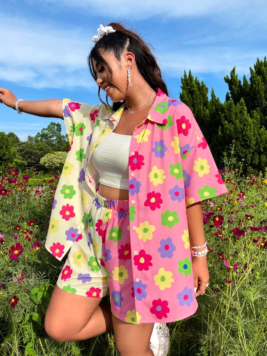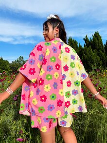 Dopamin Dressing Drop Shoulder Shirt mit Blume Muster, & Shorts