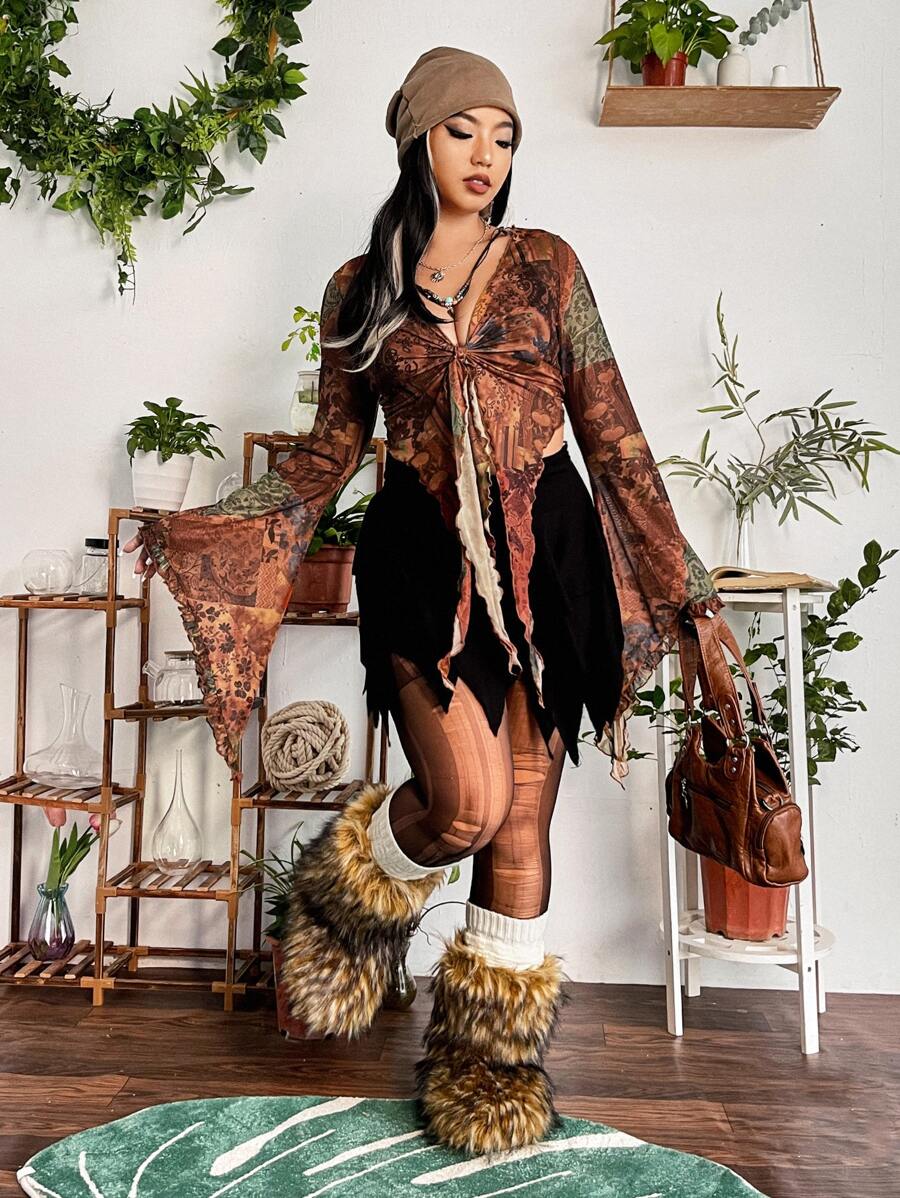 Große Größen Top mit Blumen- und Paisley-Muster, Schleife vorne, Trompetenärmeln und Mesh, Schule