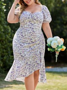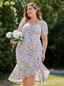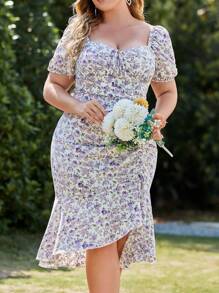 Kleid mit Blume Muster, Band vorne, Puffärmeln, Stufensaum